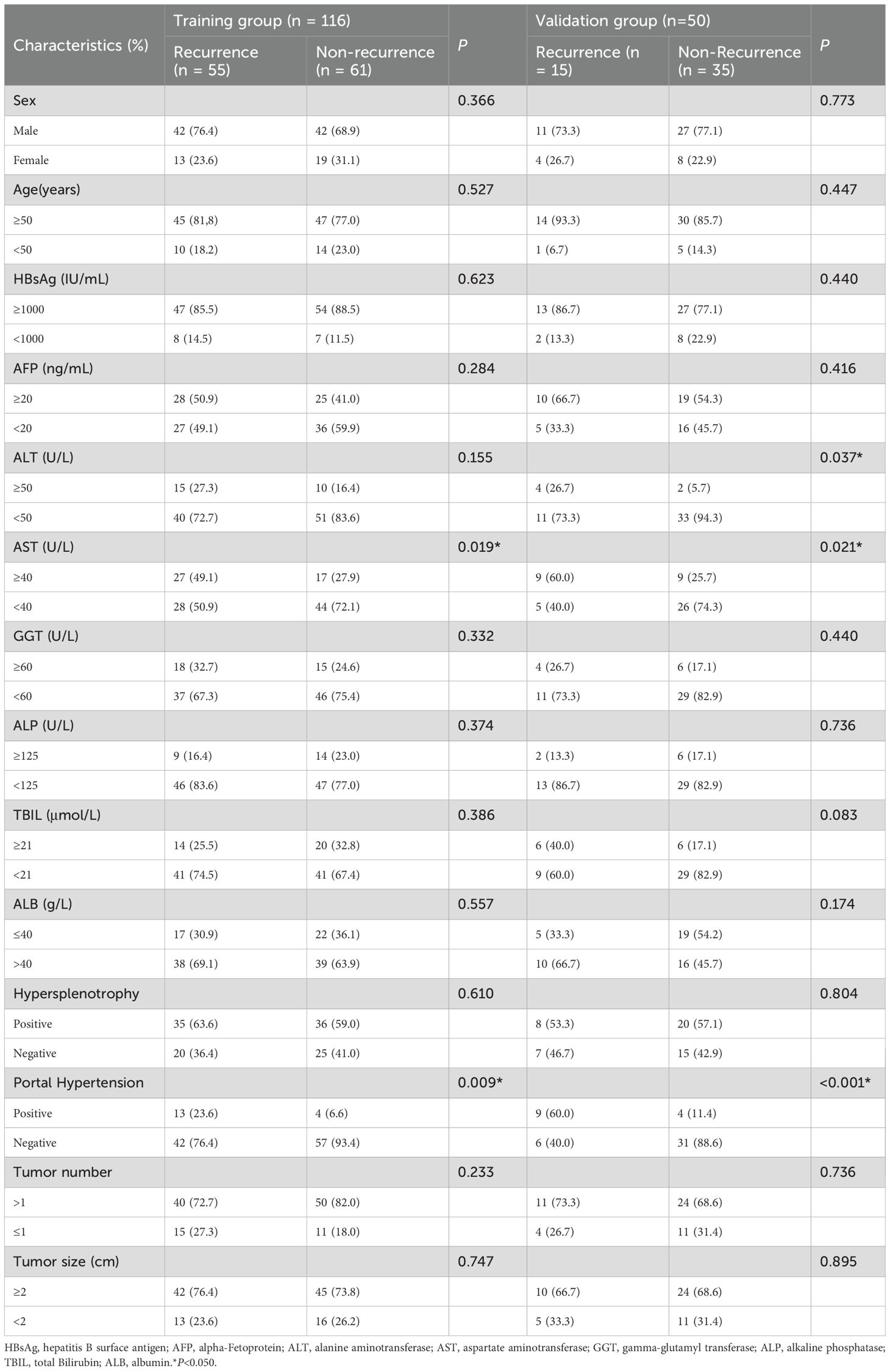A total of 166 individuals were included in this study, including 116 in the training group and 50 in the validation group. There were 70 patients (42.2%) with HBV-HCC recurrence within 1 year after microwave ablation. A total of 116 patients were included in the training group, 55 (47.4%) of whom had recurrence within 1 year, while 15 (30.0%) of the 50 patients included in the validation group also had recurrence within 1 year. The clinicopathological features of the training group and the validation group are shown in Table 1; the differences between the two groups were not statistically significant (P < 0.05).