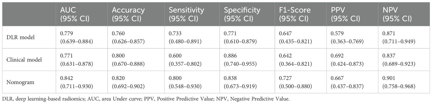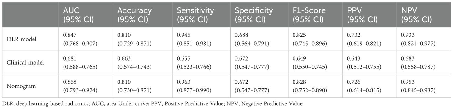 Afterwards, we used the deep learning DLR score, AST, and portal hypertension as factors for the multivariate logistic regression analysis to build personalized prediction models. According to the results of the multivariate logistic analysis, two independent clinical factors were combined with DLR scores to establish a clinical-radiological model. The combined model showed the best evaluation efficacy in both cohorts, with AUC, sensitivity, and specificity in the training group being 0.868 (95% CI: 0.793–0.924), 96.3% (95% CI: 0.877–0.990), and 67.2% (95% CI: 0.547–0.777), respectively (Figure 5b, Table 2). The AUC, sensitivity, and specificity of the validation group were 0.842 (95% CI: 0.711–0.930), 80.0% (95% CI: 0.548–0.930), and 83.8% (95% CI: 0.673-0.919), respectively (Figure 5d, Table 3). In terms of accuracy, the nomogram also outperformed other models (training group, 81.0% vs. DLR: 81.0%, clinical: 66.3%; validation group, 82.0% vs. DLR: 76.0%, clinical: 80.0%). In addition, the F1-score was highest for the nomogram (training group, 0.828, vs. DLR: 0.825, clinical: 0.649; validation group, 0.727 vs. DLR: 0.647, clinical: 0.642), reflecting its balanced performance in imbalanced data scenarios. Regarding negative predictions, the nomogram also demonstrated the best NPV in both the training group (95.3% vs. DLR: 93.3%, clinical: 68.3%) and the validation group (90.1% vs. DLR: 87.1%, clinical: 83.7%), indicating high reliability in ruling out the target condition. The nomogram emerged as the most robust tool, combining high discriminative power (AUC) with balanced sensitivity-specificity profiles. Finally, we visualized the model as a nomogram for clinicians (Figure 5e).