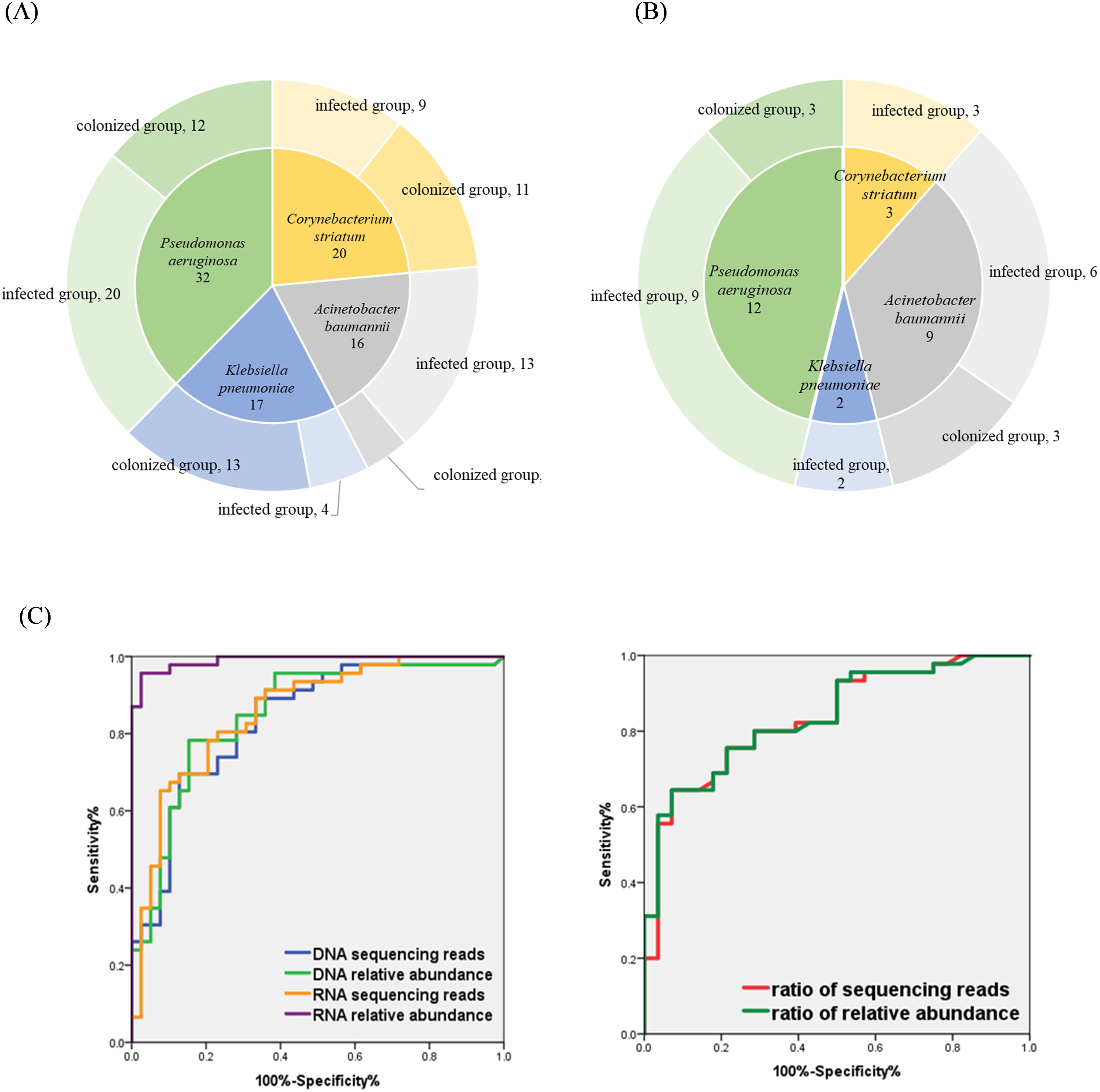 Figure 1. (A) Distribution of the four bacterial species in mNGS results; (B) Distribution of four bacterial species in conventional culture results; (C) Evaluating the performance of indicators to identify bacterial infection and colonization using ROC curves.