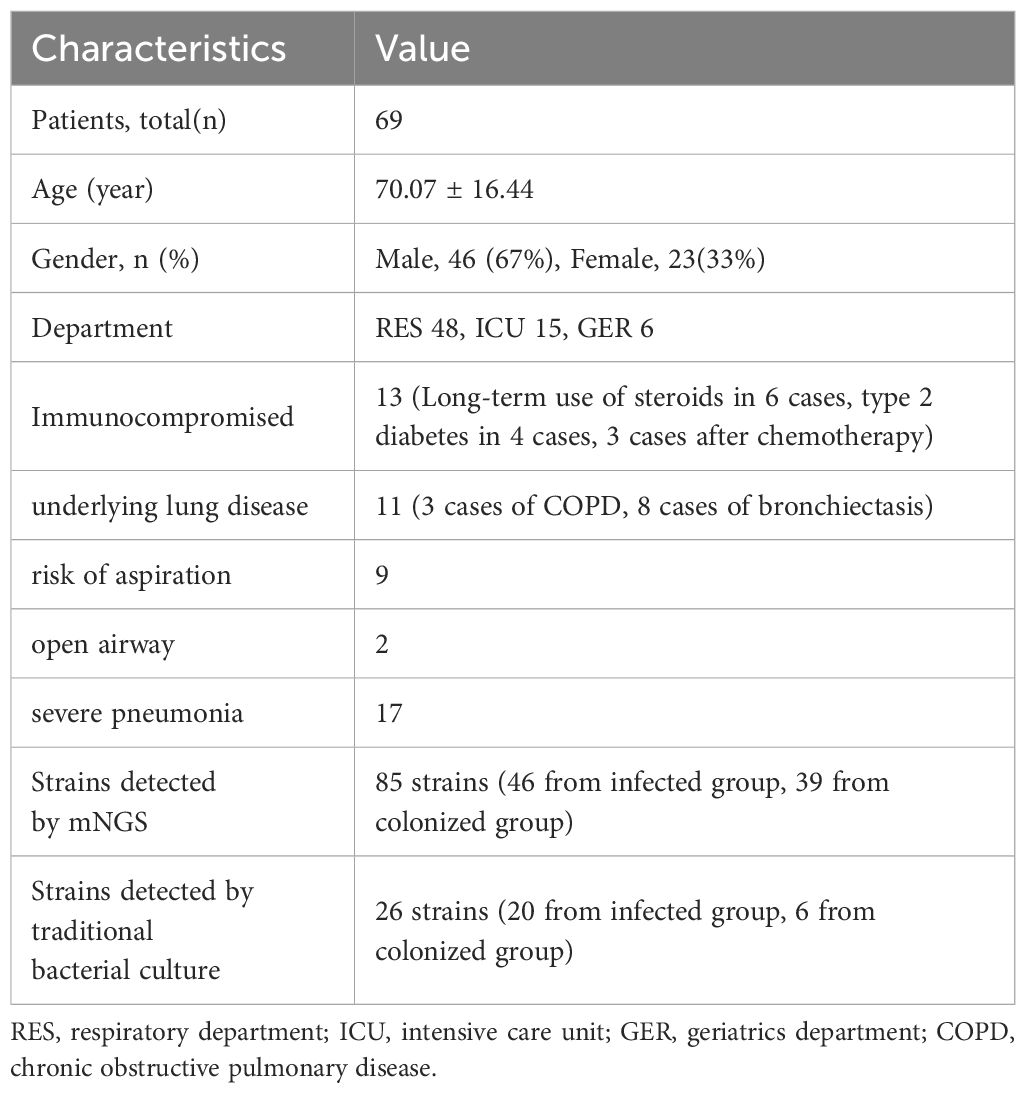The final diagnosis of LRTIs in 69 patients was established after comprehensive evaluation by two chief respiratory physicians, discrepant results were adjudicated by a third expert. Assessment involves: 1. Patient’s baseline immune status and bacterial infection-related risk factors (presence/absence).2. The patient’s clinical symptoms; 3. Chest CT or X-ray findings;4. Traditional microbiologic tests, mNGS, complete blood count (CBC), C-reactive protein(CRP), procalcitonin (PCT), and other indicators of infection, as well as serological examinations [including fungal (1-3)-β-D glucan test, serum cryptococcal capsular polysaccharide antigen test, and Mycoplasma pneumoniae serological antibody detection].5.Re-evaluation and correction of the final diagnosis based on the patient’s clinical outcomes following treatment. Bacteria detected by conventional testing or mNGS were considered true positives (infected group) only if they were consistent with the final clinical diagnosis; otherwise, they were considered false positives (colonized group).