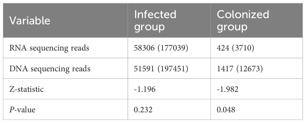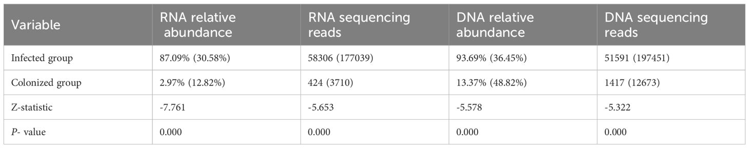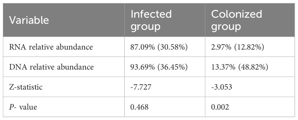 Statistical results showed:1. In the infected group, the number of bacterial RNA sequencing reads, RNA relative abundance, the number of DNA sequencing reads, and DNA relative abundance were all significantly higher than those in the colonized group, with statistically significant differences (all P-values < 0.001, see Table 2). 2. Within the infected group, for the same bacterial species, both the number of RNA sequencing reads and relative abundance were higher than those of DNA detection, though no statistically significant differences were observed (all P-values > 0.05). In contrast, within the colonized group, RNA relative abundance was significantly lower than DNA relative abundance, and the number of RNA sequencing reads were significantly lower than the number of DNA sequencing reads, with statistically significant differences (all P-values < 0.05; Tables 3, 4).