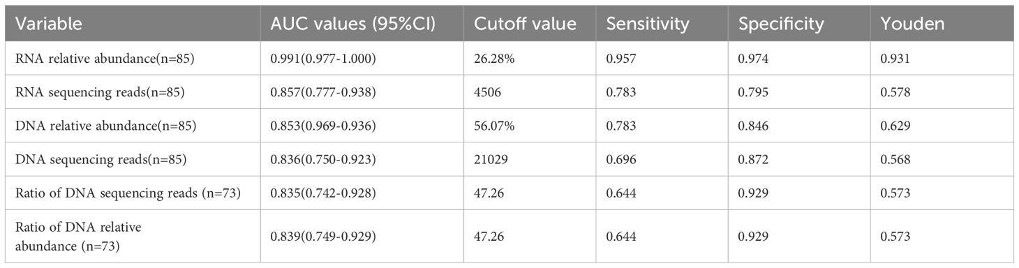With the final clinical diagnosis as the gold standard, ROC curves were used to assess the performance of sequencing reads and relative abundance of each bacterial species in distinguishing between infection or colonization. As shown in Figure 1C and Table 5: The area under the curve (AUC) of bacterial RNA relative abundance was 0.991 (95%CI:0.977-1.000), P<0.001; the cutoff value was 26.28%, the sensitivity was 0.957, and specificity was 0.974. The AUC of bacterial RNA sequencing reads was 0.857 (95%CI:0.777-0.938), P<0.001; the cutoff value was 4506, the sensitivity was 0.783, and specificity was 0.795. The AUC of bacterial DNA relative abundance was 0.853 (95%CI:0.969-0.936), P<0.001; the cutoff value was 56.07%, the sensitivity was 0.783, and specificity was 0.846.The AUC of bacterial DNA sequencing reads was 0.836 (95%CI:0.750-0.923), P<0.001; the cutoff value was 21029, the sensitivity was 0.696, and specificity was 0.872.