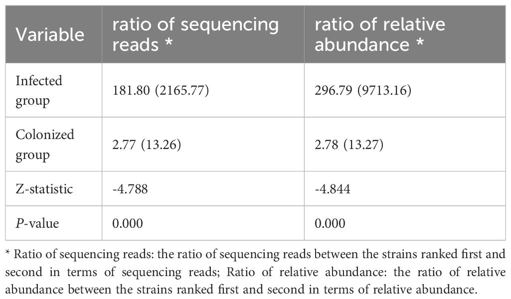 Table 6. Comparison between two groups of sequencing reads ratios and relative abundance ratios in the DNA-mNGS [M (IQR)].