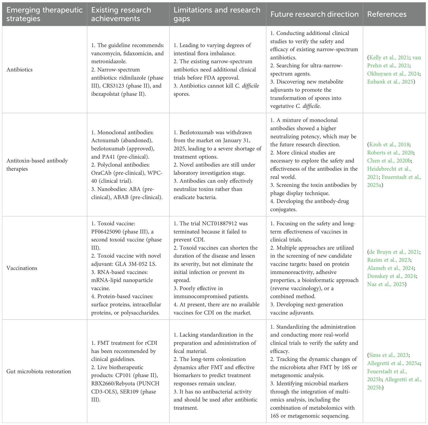 Treatment for CDI varies worldwide according to these clinical guidelines. Antibiotics remain the first-line treatment option, however they can interfere with the normal gut microbiota composition, leading to the recurrence of infection (Sehgal et al., 2022; Kapandji et al., 2025). At present, several narrow-spectrum antibiotics specifically for C. difficile, such as ridinilazole (phase III) and ibezapolstat (phase II), are undergoing clinical trials (Okhuysen et al., 2024; Eubank et al., 2025). Given the remarkable results, these antibiotics are expected to be widely applied clinically in the future. In recent years, it has been recognized that a balanced gut microbiota plays a crucial role in maintaining the health of the host (Liu et al., 2023; Chen et al., 2023). FMT has emerged as a powerful therapeutic approach for managing patients with rCDI. However, the lack of standardization in preparation and administration of fecal material poses inherent risks and limits its large-scale application (Wilcox et al., 2020; Feuerstadt et al., 2022). Although SER-109 and REBYOTA have currently been approved by the FDA to prevent rCDI, more real-world clinical trials are needed to further confirm their safety and efficacy (Gonzales-Luna et al., 2023). Antitoxin-targeted therapies for C. difficile toxins, as well as the development of vaccines utilizing inactivated toxins, have also achieved promising results preclinically, and have gradually progressed to clinical trials (Bratkovic et al., 2024). Further studies are still needed to evaluate their long-term efficacy and safety. CDI remains a significant challenge in the health field, and it is urgent to develop new therapies to control the increasing incidence, rising severity and high recurrence rate of CDI. Table 1 summarizes the existing achievements, limitations, as well as the future direction of progress in CDI treatment.