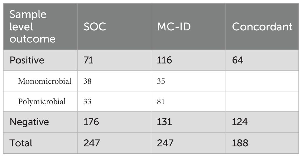 Positivity rates of 247 peritoneal effusion samples from 209 patients were compared between the standard of care (SOC) and MC-ID. The average age of participants was 59.5 years old, and the gender distribution was 59.1% male and 40.9% female. Of the 247 samples, 71 were positive in SOC (28.7%), whereas 116 samples (47%) were positive in MC-ID, with 64 samples concordant (Table 1). Two samples, where SOC identified species outside of MC-ID primer coverage (Candida albicans and Mycoplasma hominis), were considered as concordant negative. PPA between MC-ID and SOC at the sample level was 90.1% (IC 95%, 81.0% to 95.1%), NPA was 70.5% (IC 95%, 63.3% to 76.7%). MC-ID yielded 1.6x more positive samples than SOC (Figure 1).