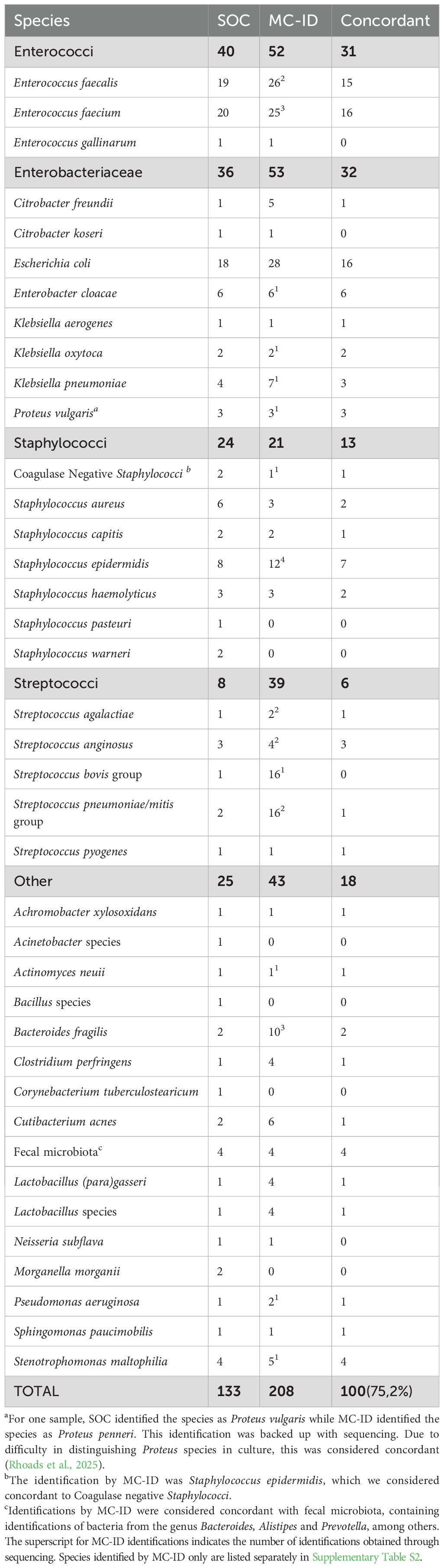 Of the 133 species identifications by SOC, 100 were concordant with MC-ID. PPA at the species level was 75.2% (95% CI 67.2% to 81.8%) (Table 2). The species most often detected by both methods were common BP pathogens such as Escherichia coli, Enterococcus faecalis and Enterococcus faecium (Ding et al., 2019). Most samples with discrepant species identifications were polymicrobial for both methods (79%). For all but one of those samples, MC-ID found at least one species concordant with SOC (Supplementary Table S1).