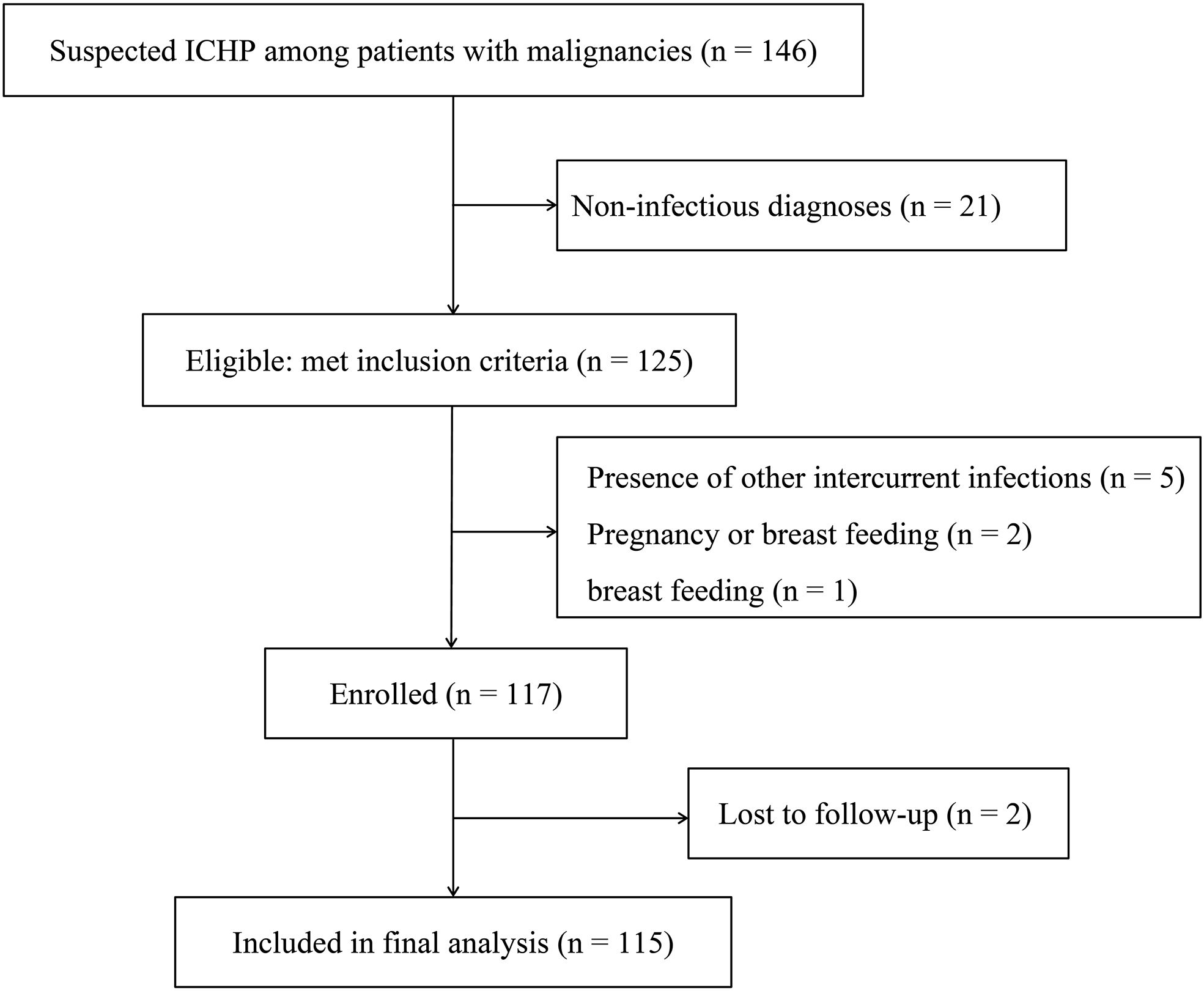 Furthermore, data on ICHP in patients with malignancies are scarce. Despite clinicians widely recognize the heightened risk of lung infections in immunocompromised patients, they are often excluded from pneumonia clinical guidelines and treatment trials (Woodhead et al., 2011; Olson and Davis, 2020; Rello, 2024). Despite inherent limitations in differentiating colonization from infection, clinical metagenomics serves as a promising yet evolving tool for characterizing respiratory microbiota (Chiu and Miller, 2019). In this prospective study, we analyzed 115 patients with malignancies and ICHP using clinical metagenomics to characterize microbial profiles, clinical features, and outcomes, thereby informing empirical antibiotic selection and treatment optimization.
