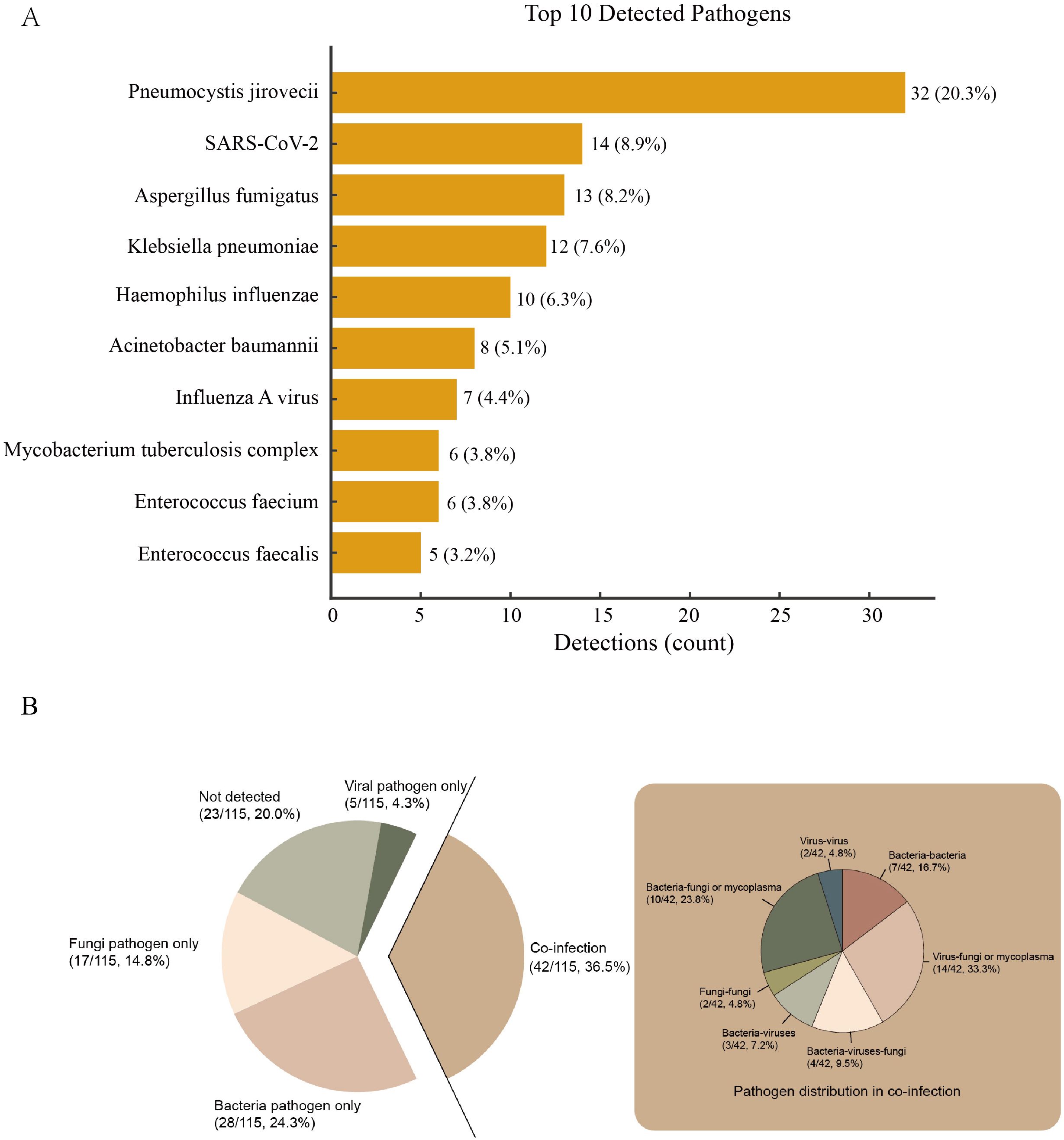 A total of 158 pathogens were identified in the 92 patients with confirmed pathogens. The most common potential pathogens detected were Pneumocystis jirovecii (32, 20.3%), SARS-CoV-2 (14, 8.9%), Aspergillus fumigatus (13, 8.2%), Klebsiella pneumoniae (12, 7.6%), Haemophilus influenzae (10, 6.3%), Acinetobacter baumannii (8, 5.1%), Influenza A virus (7, 4.4%), Mycobacterium tuberculosis complex (6, 3.8%), Enterococcus faecium (6, 3.8%) and Enterococcus faecalis (5, 3.2%) (Figure 2A).