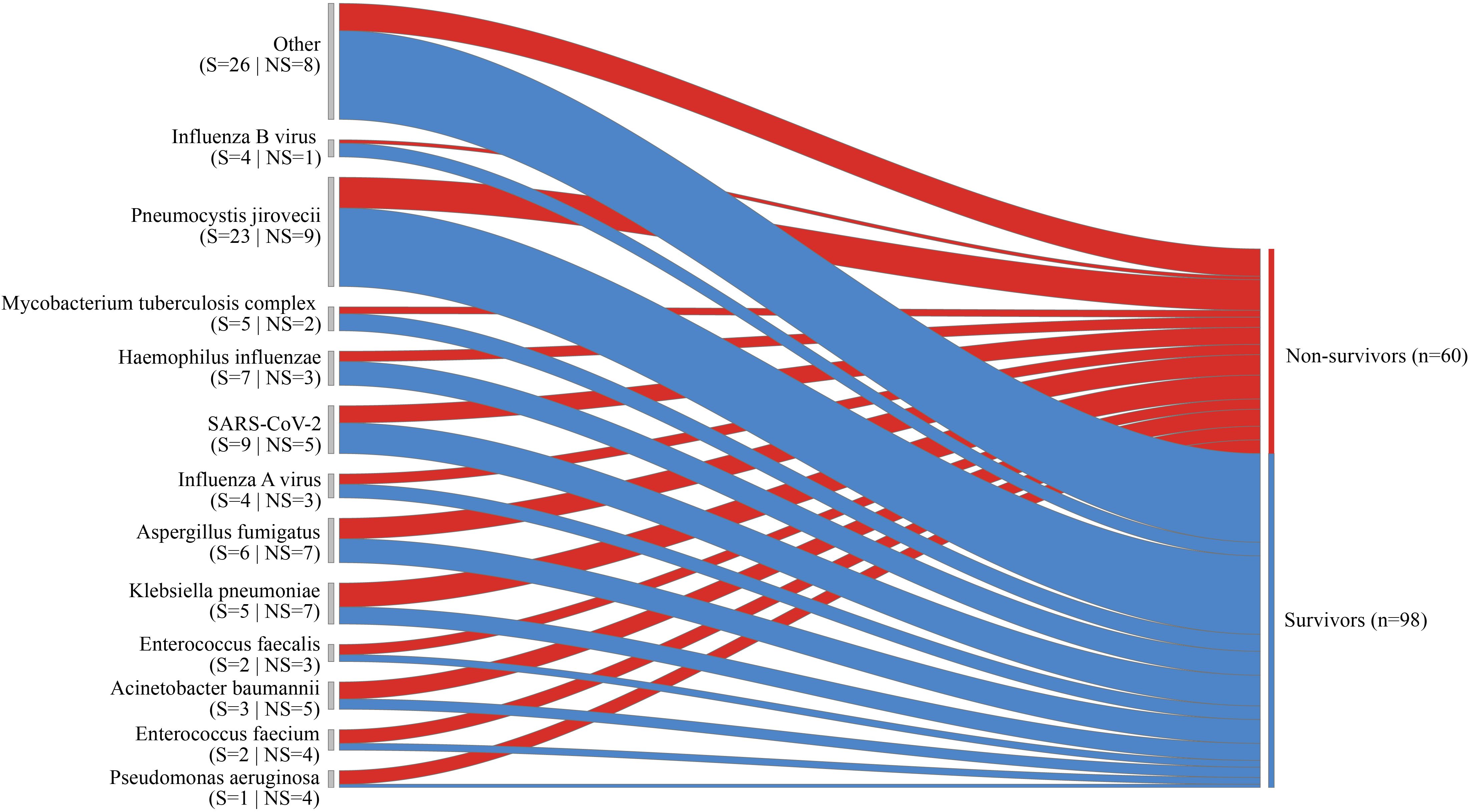 Figure 3. The Sankey diagram depicts the diverse outcomes for specific pathogens, with the width of the arrows representing the proportional flow rate of cases, categorized as survivors (indicated in blue) or non-survivors (indicated in red). The numbers displayed above the arrows correspond to the number of cases.
