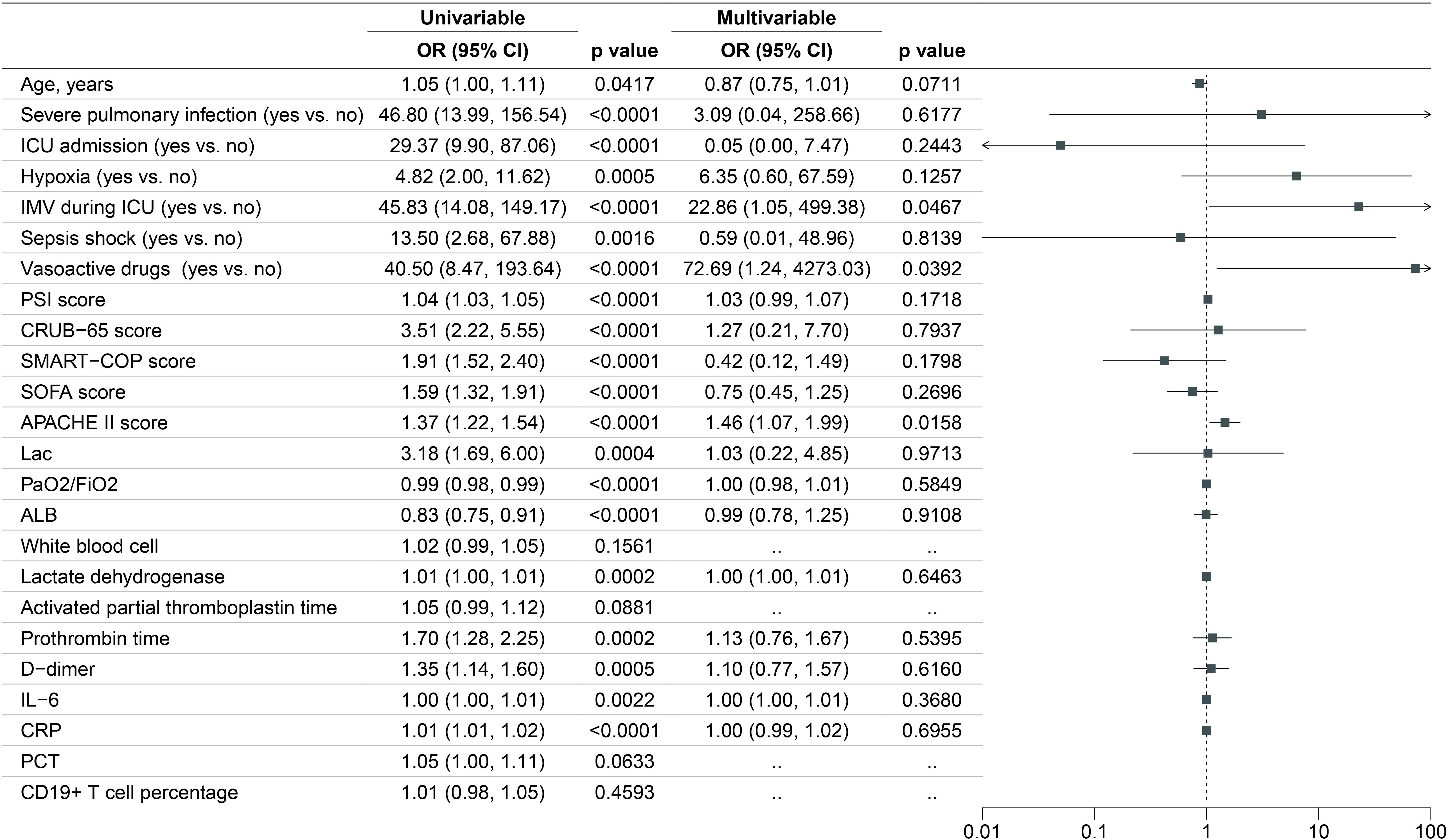 Significant differences across various variables were noted between the 28-day survivor and non-survivor groups (Supplementary Table S1). In our univariate logistic regression analysis, we examined variables including age, severe pulmonary infection, ICU admission, needed IMV, hypoxia, septic shock, vasoactive drugs, PSI score, CRUB-65 score, SMART-COP score, SOFA score, APACHE II score, Lac, PaO2/FiO2, ALB, white blood cell, lactate dehydrogenase, activated partial thromboplastin time, prothrombin time, D-dimer, IL-6, CRP, PCT, CD19+ T cell percentage. Significant differences were observed for most variables, except for white blood cell, activated partial thromboplastin time, PCT and CD19+ T cell percentage. We subsequently included the variables with P-value less than 0.05 for the multivariable logistic regression model. Figure 4 displayed the results of the univariable and multivariable logistic regression models. The results of the multivariate logistic regression are shown on the right with a forest plot. The independent risk factors for 28-day all-cause mortality were needed IMV (OR, 22.86; 95% CI, 1.05-499.38; p =0.0467), used vasoactive drugs (OR, 72.69; 95% CI, 1.24-4273.03; p =0.0392) and higher APACHE II score (OR, 1.46; 95% CI, 1.07, 1.99; p=0.0158).