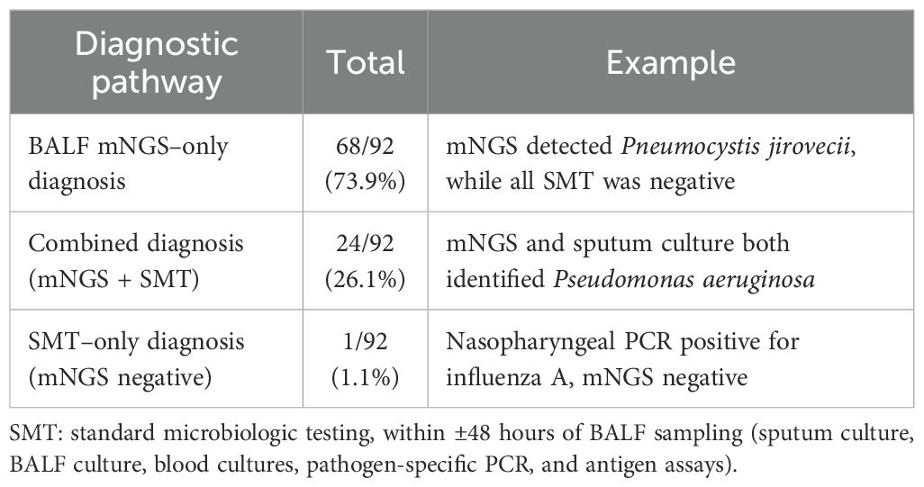 Definition of BALF mNGS–only diagnosis (all criteria required): a) BALF mNGS is positive; b) Within ±48 hours of bronchoalveolar lavage(BAL)sampling, no SMT is positive for the same pathogen (species/genus, or—when the final diagnosis is category-level only—within the same pathogen category/spectrum); c) Per prespecified clinical attribution rules, the detection is adjudicated as etiologic for the current episode (excluding obvious colonization/contamination).