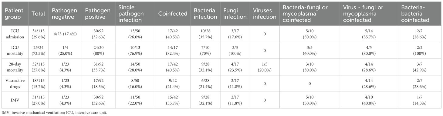 Results: Pathogens were detected in 92 patients (80.0%), with 158 potential pathogens detected. Etiologic diagnoses were established by BALF mNGS alone in 68 (73.9%), by combined mNGS plus standard microbiologic testing (SMT) in 24 (26.1%), and by SMT alone in 1 (1.1%). Pneumocystis jirovecii (32, 20.3%), SARS-CoV-2 (14, 8.9%), Aspergillus fumigatus (13, 8.2%), Klebsiella pneumoniae (12, 7.6%) and Haemophilus influenzae (10, 6.3%) were the five most common pathogens. Coinfections occurred in 36.5% of all enrolled patients. Death at 28 days, ICU admission, Death at ICU was more frequent among patients with polymicrobial infections than single pathogen infection, though this difference was not statistically significant. Use rate of vasoactive drugs was significantly higher in patients with coinfection than in patients with single-pathogen infection (39.1% vs. 16.0%). invasive mechanical ventilation (IMV) (OR = 22.86, p=0.047), vasopressor use (OR = 72.69, p=0.039), and higher Acute Physiology and Chronic Health Evaluation II (APACHE II) scores (OR = 1.46, p=0.016) were associated with increased 28-day all-cause mortality.