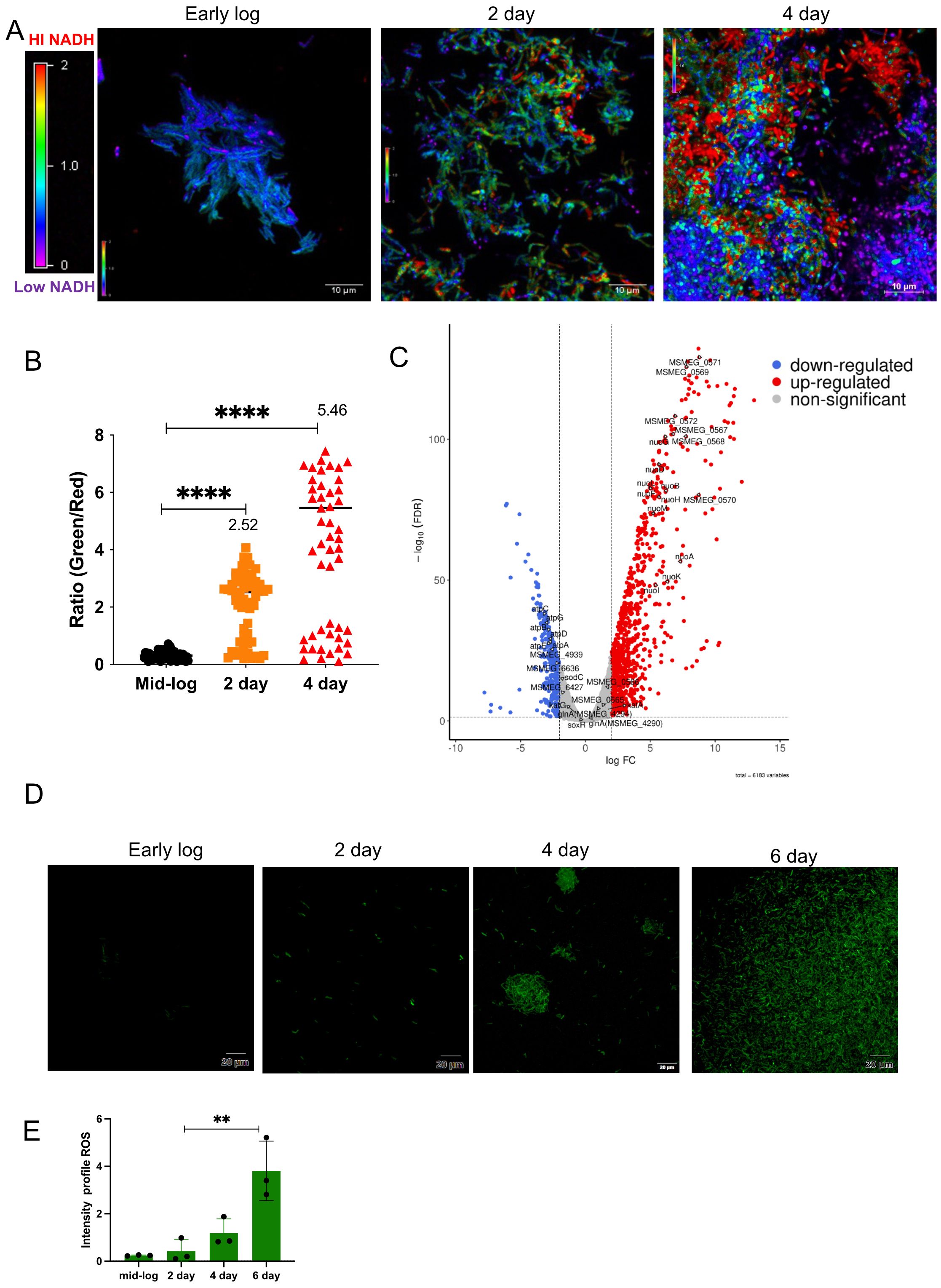 Figure 1. Determination of ROS levels in biofilm using a ROS indicator. (A) The intracellular redox status within the biofilm culture was determined using a Peredox–NADH biosensor. M. smegmatis mc2155 was seeded for biofilm formation with a sterile glass coverslip in 24-well plates, and NADH levels were monitored at 2 and 4 days, with early-log-phase culture as the control. Biofilm cultures were observed under a microscope. The images were assigned pseudo-colors to represent NADH/NAD+ levels in individual cells using a color heat map. The experiment was repeated at least twice, with two replicates each. (B) Quantification of NADH/NAD+ ratios from three independent fields containing 60 planktonic and 60 biofilm cells. Median values are plotted for 2 and 4 days. Variation between samples was analyzed using one-way ANOVA (****P < 0.0001). (C) Volcano plot depicting upregulated and downregulated genes on the 6th day of biofilm culture compared with planktonic culture, analyzed by RNA-Seq. (D) M. smegmatis mc2155 was seeded for biofilm formation in triplicate. After 2 and 4 days of incubation, cells were harvested, washed, stained with the CM-CH2DCFDA ROS indicator, and subjected to CLSM. Fluorescent images were acquired, and a representative image is shown. (E) Mean fluorescence intensity from three independent fields for each time point was plotted, and data were compared using one-way ANOVA (**P < 0.01).