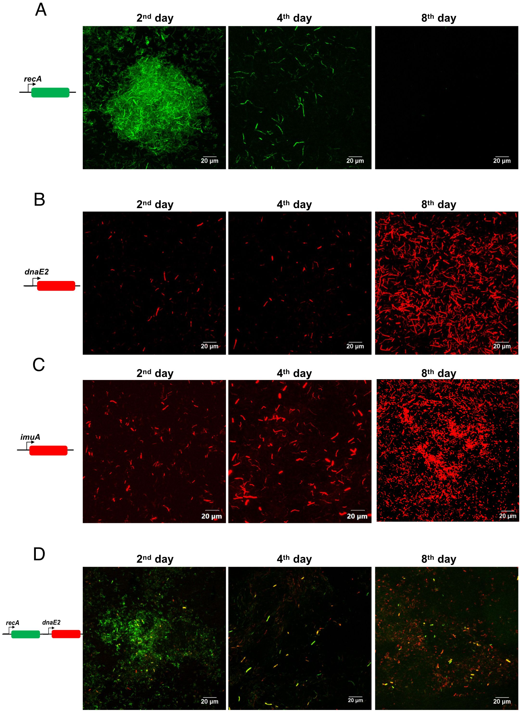 Figure 2. Expression analysis of recA, dnaE2, and ImuA’ in the biofilm. (A) M. smegmatis harboring pMV262 PrecA~mClover was seeded for biofilm formation with a sterile glass coverslip in a 24-well plate and incubated for 8 days. After incubation, the medium was removed, and the biofilm layer on the coverslip was imaged. Fluorescent images were acquired at defined time points, and a representative image from triplicate experiments is shown. (B) M. smegmatis with pMV262 PdnaE2~mCherry was seeded for biofilm formation as described above, and fluorescent images were acquired at defined time points. Representative images from triplicates are shown. (C) M. smegmatis with pMV262 PImuA’~mCherry was seeded for biofilm formation for 8 days, and fluorescent images were acquired at defined time points. A representative image from triplicates is shown. (D) M. smegmatis harboring the dual reporter pMV262 PrecA~mClover and PdnaE2~mCherry was seeded for biofilm formation and incubated for 8 days. Fluorescent images corresponding to the expression of PrecA (green) and PdnaE2 (red) were acquired at defined time intervals, and merged images are presented.