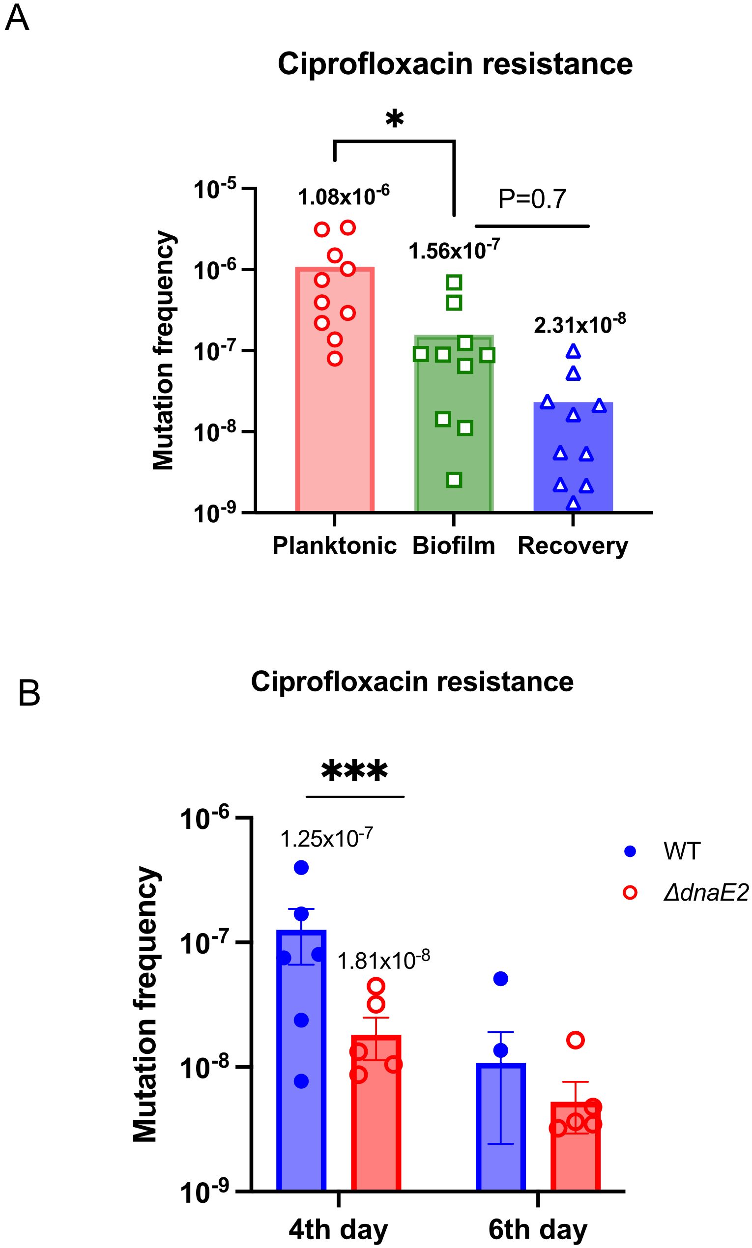 Figure 3. Contribution of dnaE2 expression to bacterial heterogeneity in biofilms. (A) Ten replicates of 2 mL cultures of the WT strain from planktonic, 6th-day biofilm, and 6th-day biofilm that was mechanically disrupted and recovered in 7H9 medium for 3 h (biofilm-to-planktonic recovery stage) were harvested and plated on 7H10 plates containing ciprofloxacin to score for mutants. Small aliquots were plated to determine viable counts. Mutation frequency for each condition was determined, and individual values were plotted using GraphPad Prism® v8. Differences between mean mutation frequencies were tested using Student’s t-test (P < 0.05). (B) Twelve biofilm cultures each of the WT and ΔdnaE2 strains were harvested and plated on 7H10 plates containing ciprofloxacin to isolate mutants on the 4th and 6th days. Small aliquots were serially diluted and plated on 7H10 plates without antibiotics for viable counts. Mutation frequency was calculated as the ratio of the number of mutants to the viable count for each replicate. Individual values were plotted on a scatter plot using GraphPad Prism® v8, and the mean value for each set is indicated above the plot. For the 6th-day time point, only two of six WT replicates produced resistant colonies. Variances between 4th-day samples were tested using the F-test (P = 0.0002), P <0.5=*, ***P<0.001.