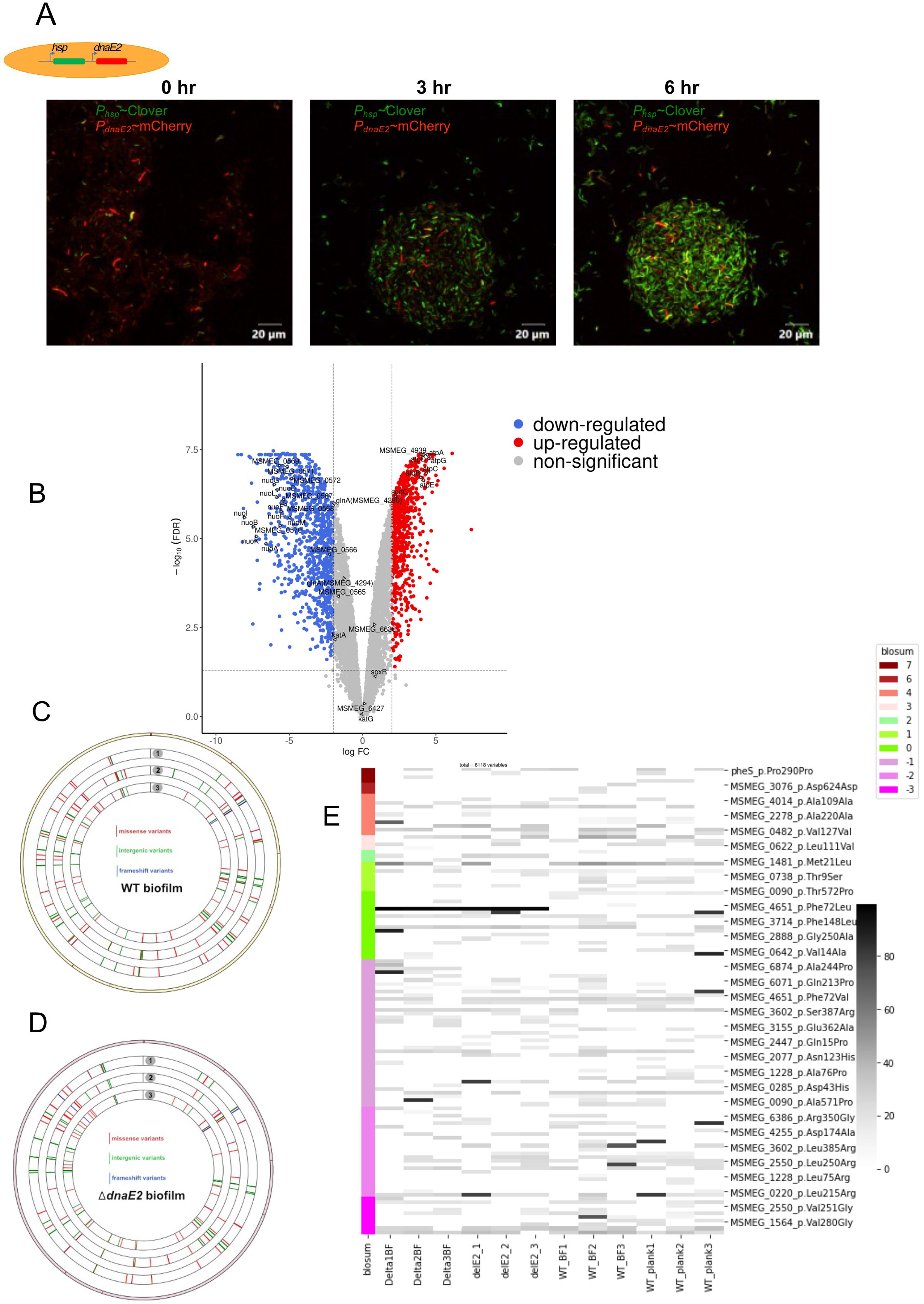 Figure 4. Gene expression during biofilm-to-planktonic transition and impact on genome-wide mutagenesis. (A) Time-course analysis of dnaE2 expression during the biofilm recovery stage of M. smegmatis using Phsp~mClover and PdnaE2~mCherry dual reporter strains in 7H9T medium. (B) Volcano plot of upregulated and downregulated genes during the recovery stage compared with biofilm culture, analyzed by RNA-Seq. (C) Circos plot representing SNPs identified in WT biofilm cultures. The outermost circle represents the reference genome, with SNPs marked in the clockwise direction. Tracks 1, 2, and 3 represent biological triplicates of WT biofilm cultures. Red bars indicate missense/non-synonymous mutations, green bars indicate intergenic mutations, and blue bars indicate frameshift mutations. (D) Circos plot representing SNPs identified in ΔdnaE2 biofilm cultures. The outermost circle represents the reference genome, with SNPs marked in the clockwise direction. Tracks 1, 2, and 3 represent biological triplicates of ΔdnaE2 biofilm cultures. Red bars indicate missense/non-synonymous mutations, green bars indicate intergenic mutations, and blue bars indicate frameshift mutations. (E) Heat map representing SNPs identified in WT and ΔdnaE2 strains under planktonic and biofilm culture conditions. A blossom score analysis represents amino acid changes. From left to right: columns 1–3, ΔdnaE2 biofilm cultures; columns 4–6, ΔdnaE2 planktonic cultures; columns 7–9, WT biofilm cultures; and columns 10–12, WT planktonic cultures. The intensity of each bar represents the percentage occurrence of mutated alleles.