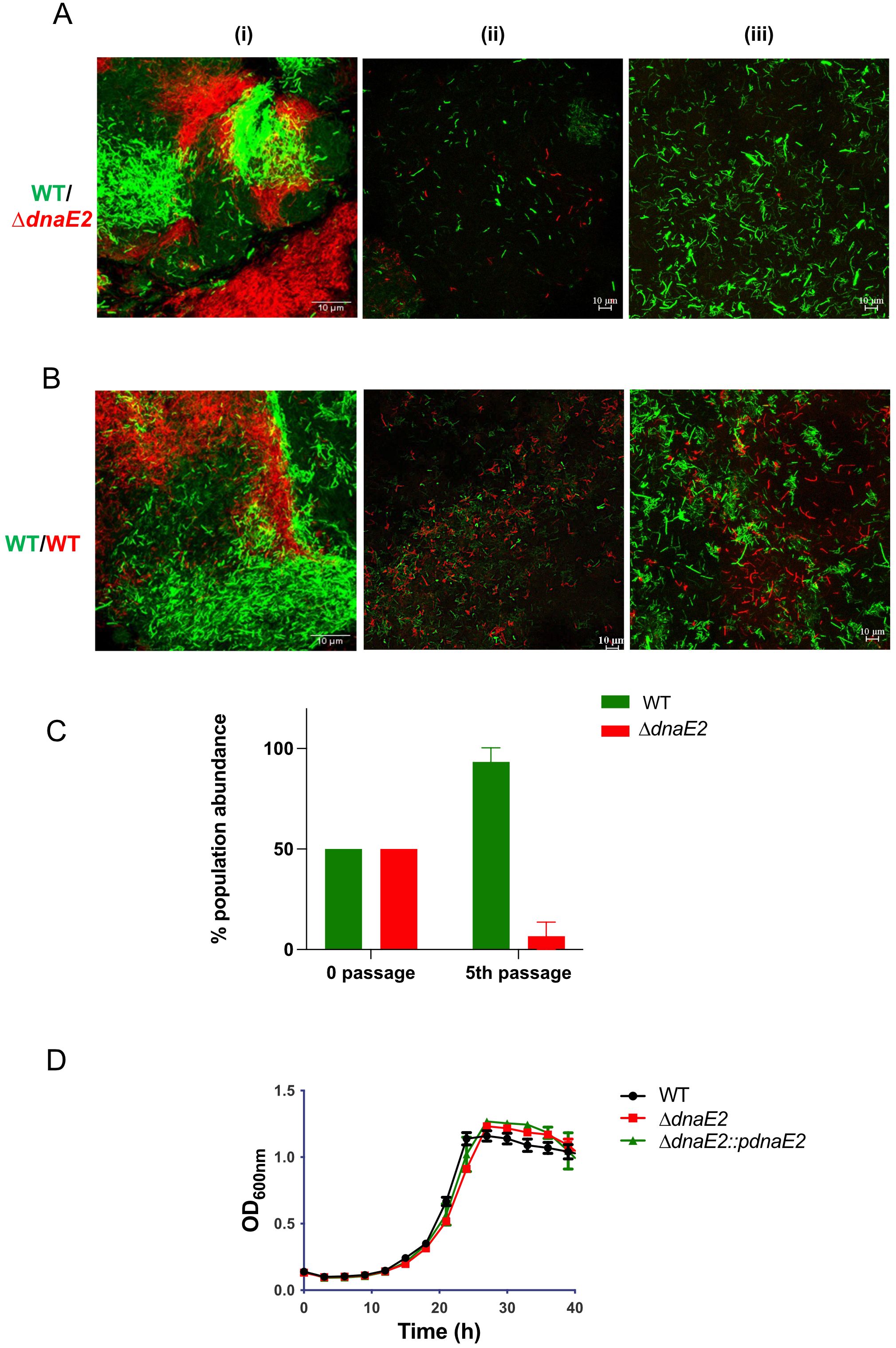 Next, we determined the fitness of the dnaE2 mutant strain compared with that of the wild-type (WT) strain by co-culturing them within the biofilm. To perform this competition study, we generated fluorescently labeled strains of WT and ΔdnaE2 encoding mClover and mCherry, respectively, under the control of the Phsp promoter. Cultures containing equal proportions of WT and ΔdnaE2 were allowed to form biofilms, and population density was observed microscopically. During the initial stages, the bacterial population density was approximately 50% for both the WT and ΔdnaE2 strains (Figure 5A, panel i; Figure 5C, 0 passage). However, upon repeated passaging, the density of ΔdnaE2 (red bacteria) drastically diminished to approximately 5% by the fifth passage in the biofilm (Figure 5A, panels ii–iii; Figure 5C, 5th passage). To rule out the potential impact of mClover or mCherry on bacterial fitness, we competed WT strains harboring mClover and mCherry and did not observe a significant reduction in population density at the 5th passage (Figure 5B, panels i–iii). To determine whether the mutant strain exhibited any growth defects, we examined the growth kinetics of WT, ΔdnaE2, and complemented strains in liquid medium. There was no significant reduction in the growth rate of the ΔdnaE2 strain when cultured independently in liquid medium (Figure 5D). These findings indicate that the observed fitness defect of the ΔdnaE2 strain in biofilm co-culture with WT is not due to an inherent growth defect.