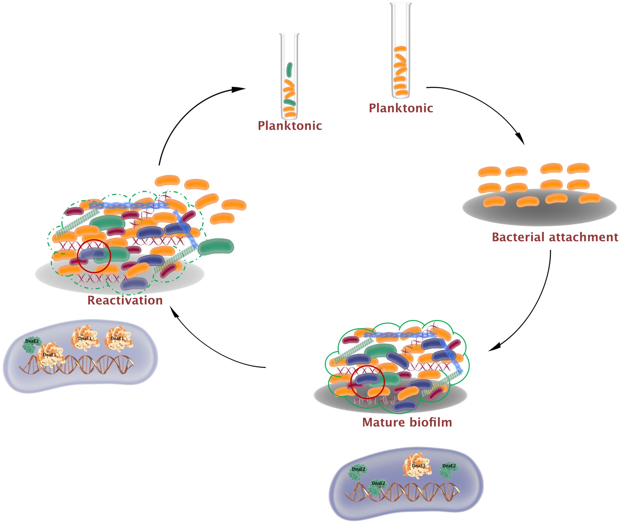 Figure 6. Mutagenesis and bacterial growth arrest by dnaE2 expression in biofilms. Biofilm formation is initiated by the attachment of mycobacteria to a substratum. During maturation, an extracellular matrix encloses a heterogeneous population consisting of dead bacteria (red), growth-arrested bacteria (blue), and mutant bacteria (green) generated by reduced DNA repair and induction of the error-prone polymerase DnaE2. Growth arrest within this subpopulation arises from conflict between DnaE2 and the housekeeping polymerase DnaE1. During reactivation from biofilm to planktonic growth, DnaE2 expression is repressed, shifting the balance toward DnaE1 and resulting in active multiplication.