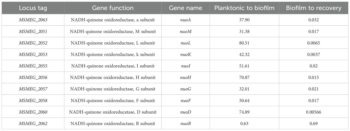 Previously, we observed that the expression of dnaE2 in antibiotic-treated M. smegmatis persister cells persisted for nearly 30h after recovery in antibiotic-free medium (Salini et al., 2022). Similarly, we monitored the dynamics of dnaE2 expression during the biofilm-to-planktonic transition (recovery) by mechanically disrupting the biofilm and culturing it in 7H9 medium with Tween 80 to prevent bacterial aggregation. Time-course microscopic analysis of the biofilm-to-planktonic transition culture revealed that within 3h of the recovery phase, there was a significant reduction in mCherry-expressing cells (PdnaE2) and reduced further decreased by 6h (Figure 4A, panels ii and iii). RNA-Seq analysis confirmed this observation and revealed that DNA repair genes downregulated during biofilm formation were induced to near planktonic levels. Furthermore, expression of the nuoA–nuoM gene cluster was downregulated, whereas the atpA–atpG cluster was upregulated, representing a complete reversal of the biofilm state (Figure 4B, Tables 1, 2; Supplementary Data Sheet 2).