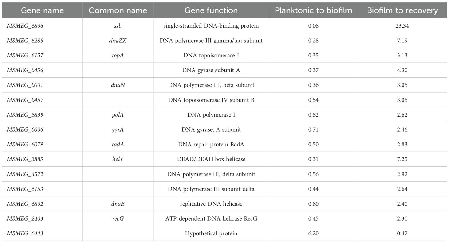 Table 3. Genes involved in DNA replication that are differentially regulated during biofilm formation and recovery stages (1-no change, <0.5-down-regulated, >1.5 up-regulated).