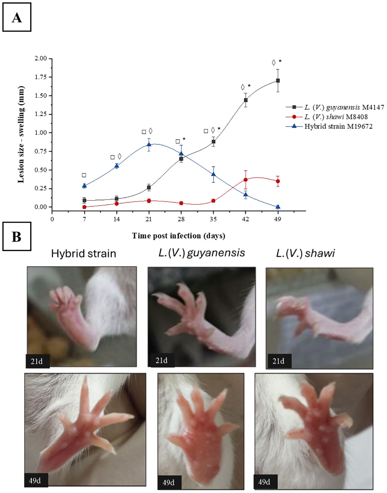 Figure 1. Swelling progression of the BALB/c mouse foot caused by the hybrid strain M19672, L. (V.) guyanensis (M4147) and L. (V.) shawi (M8408). (A), Swelling. Symbols (*, ◊, □): indicate statistical significance (P < 0.05) among the different analyzed groups: * = L. (V.) guyanensis × L. (V.) shawi; ◊: L. (V.) guyanensis × M19672; □ = L. (V.) shawi × M19672. Data presented consists of the mean values ± standard error. (B), BALB/c swelling mouse foot at 21- and 49-days PI.