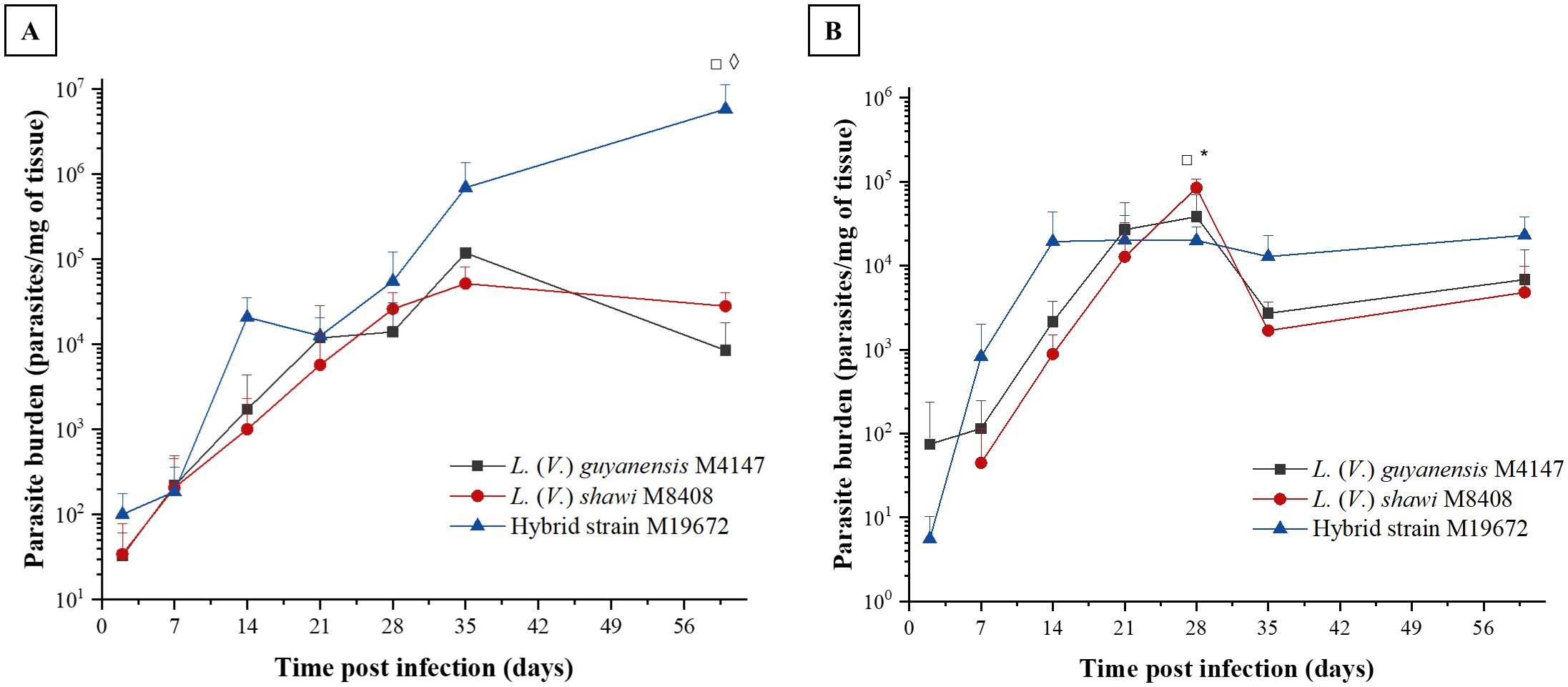 Figure 2. Parasite load in BALB/c mouse skin (A) and lymph node (B) caused by infection with hybrid parasite M19672, L. (V.) guyanensis (M4147), and L. (V.) shawi (M8408). The mice were inoculated with 106 parasites in the stationary phase in the hind footpad. Symbols (*, ◊, □): indicate statistical significance (P < 0.05) among the different analyzed groups: ◊: L. (V.) guyanensis × hybrid (M19672); □ = L. (V.) shawi × M19672; * = L. (V.) guyanensis × L. (V.) shawi. The data presented are the mean values ± standard error.