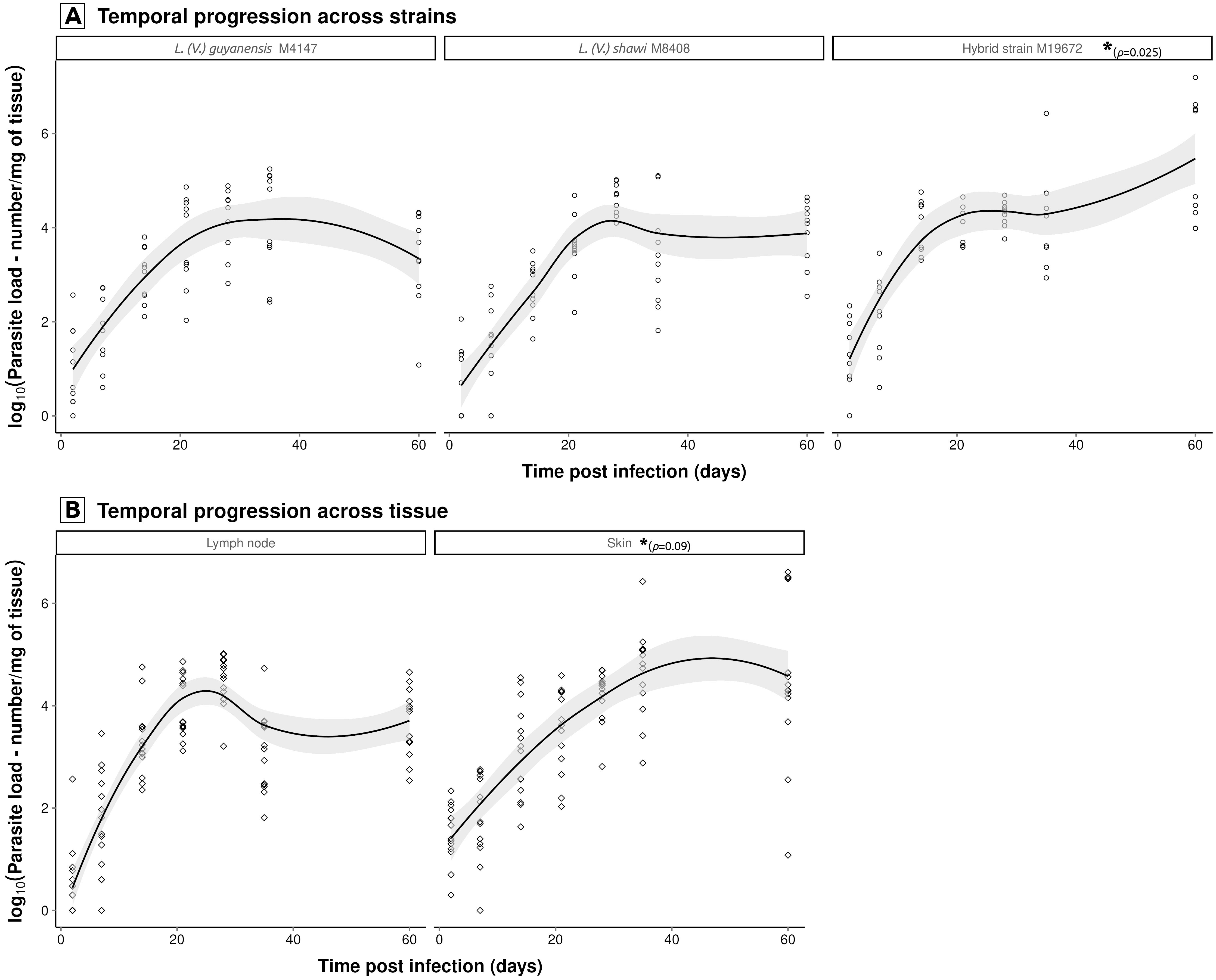 Figure 3. Significant temporal interactions modulating Leishmania parasite load dynamics. Multiple regression modeling of log10-transformed (log10 + 1) parasite loads (promastigotes/mg tissue) identified two key interaction effects: (A) strain × time (hybrid strain M19672 load exhibited significantly higher proliferation intensity (p<0.05) than both L. (V.) guyanensis (M4147) and L. (V.) shawi (M8408), which showed similar kinetic, and (B) tissue × time (skin demonstrated elevated parasite loads compared to lymph node, regardless Leishmania strain). Non-parametric LOESS curves (span = 0.75) with 95% confidence bands illustrate overall trends. Statistically significant pairwise differences, indicated by asterisks and respective p-values, were identified through linear modeling of log10-transformed data.