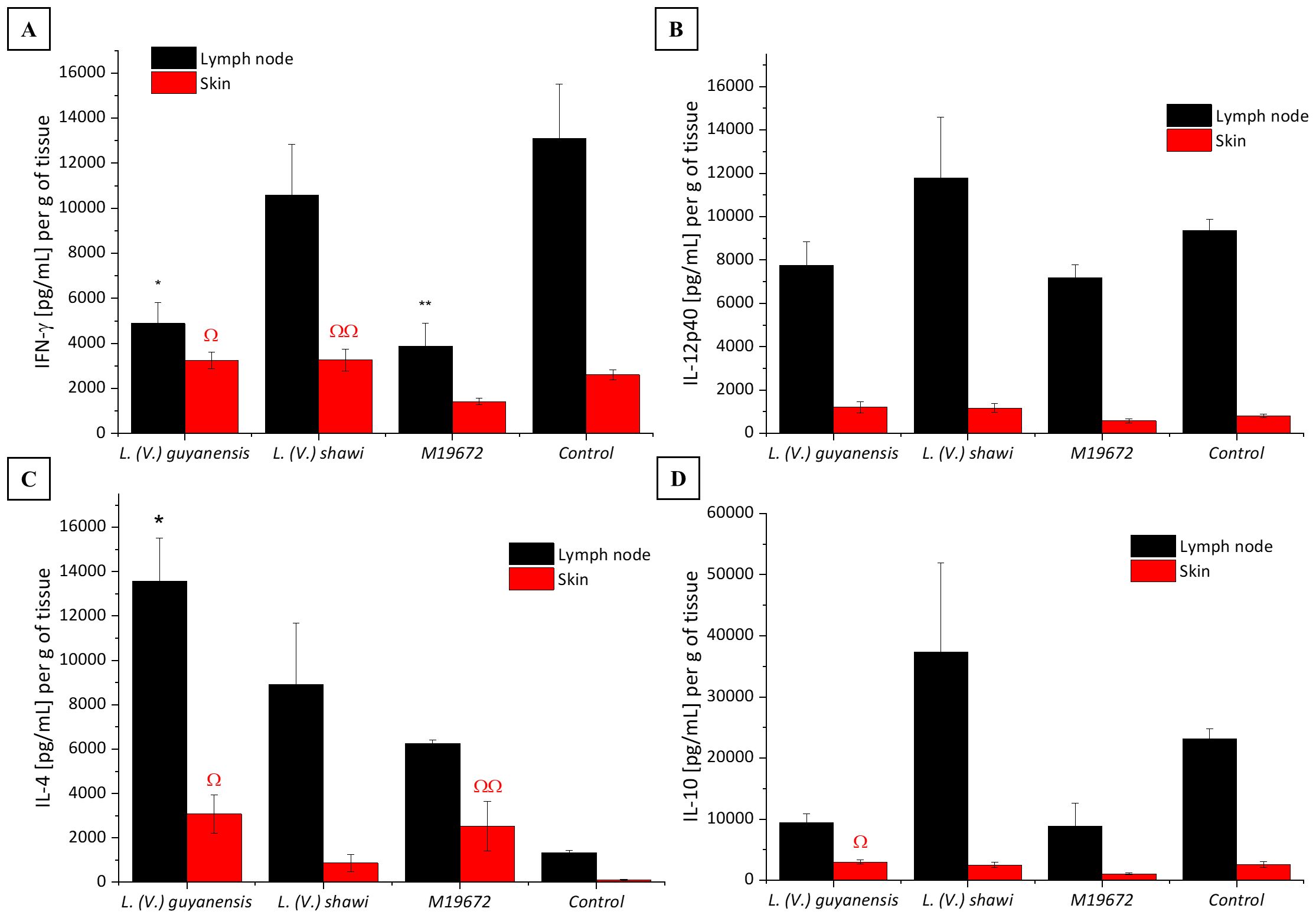Figure 4. Quantitative analysis of cytokines in experimental BALB/c infection by different Leishmania (Viannia) species at 35 days PI. Data presented are the mean values ± standard error. (A) INF-γ production in skin and lymph node of BALB/c mice infected by hybrid strain M19672, L. (V.) guyanensis (M4147), L. (V.) shawi (M8408), and non-infected control group. (B) IL-12p40 production in skin and lymph node of BALB/c mice infected by hybrid strain M19672, L. (V.) guyanensis (M4147), L. (V.) shawi (M8408), and non-infected control group. (C) IL-4 production in skin and lymph node of BALB/c mice infected by hybrid strain M19672, L. (V.) guyanensis, L. (V.) shawi, and non-infected control group. (D) IL-10 production in skin and lymph node of BALB/c mice infected by hybrid strain M19672, L. (V.) guyanensis (M4147), L. (V.) shawi (M8408), and non-infected control group. Ω: p-value < 0.05 to L. (V.) guyanensis infection compared to M19672 infected group. ΩΩ p-value < 0.05 to L. (V.) shawi infection compared to M19672 infected group. *p-value < 0.05 to L. (V.) guyanensis infection compared to control group. **p-value < 0.05 to M19672 infection compared to control group.