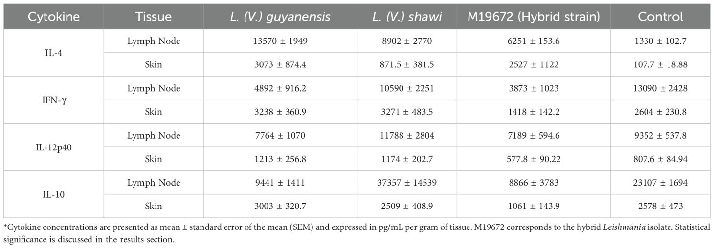 Discussion: The immunologic response of hybrid parasite infection was associated with reduced gamma interferon (IFN-γ) and elevated interleukin 4 (IL-4) production compared to parental species and controls (P < 0.05), with no significant differences observed in interleukin 12 (IL-12p40) or interleukin 10 (IL-10). Infection with L. (V.) guyanensis led to decreased IFN-γ in lymph nodes and increased IL-4 production in both skin and lymph nodes, whereas L. (V.) shawi infection did not significantly alter cytokine profiles.