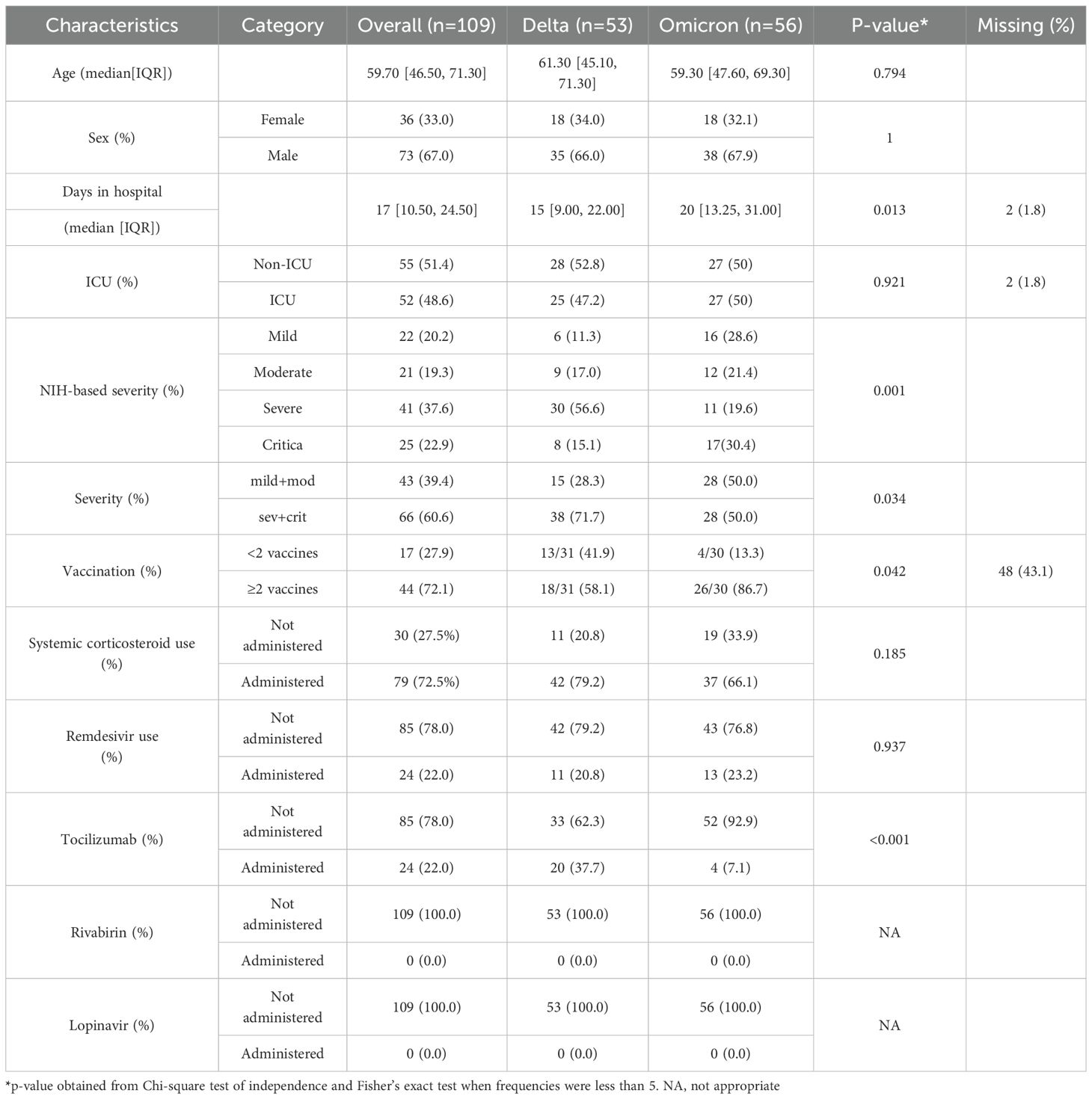 Hospital stay duration differed significantly: the Omicron group had a longer median stay (20 days; IQR = 13.25-31) than the Delta group (15 days; IQR = 9.00–22.00, p = 0.013). Although ICU admission rates were similar (47.2% Delta vs 50% Omicron, p = 0.921), NIH-based severity classification revealed that Delta patients had a greater proportion of severe and critical cases combined (71.7%) compared to Omicron (50.0%, p=0.133). Conversely, Omicron exhibited a higher rate of mild and moderate cases (50.0%) compared to Delta patients (28.3%, p=0.033). Complete vaccination (≥2 doses) was more common in Omicron cases (86.7%) than in Delta (58.1%, p = 0.145), whereas fewer than two doses were observed in 41.9% of Delta versus 13.3% of Omicron patients (p = 0.026). Corticosteroid usage rates were high overall (79.2% Delta vs. 66.1% Omicron, p=0.326), while tocilizumab administration differed significantly (37.7% in Delta vs. 7.1% in Omicron, p=0.001) (Table 1).