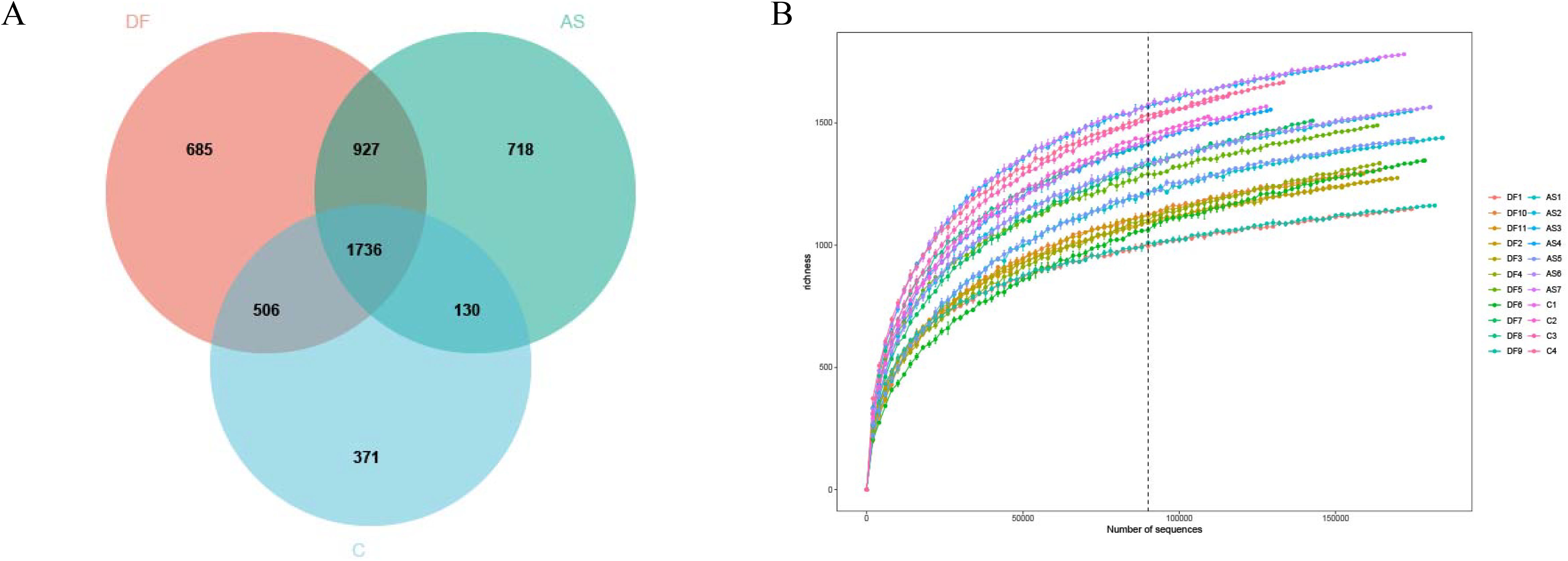 A total of 3,854 amplicon sequence variants (ASVs) were identified in this study, spanning 54 phyla, 121 classes, 216 orders, 376 families, and 861 genera. A Venn diagram was constructed to illustrate the distribution of ASVs among the three groups (Figure 1A), showing that 1,746 ASVs were shared across all samples. The DF group contained 3,854 ASVs, the AS group had 3,511 ASVs, and the C group had 2,743 ASVs. Specifically, 684 unique ASVs were found in the DF group, 718 in the AS group, and 371 in the C group. Rarefaction curves for the three groups approached a plateau (Figure 1B), indicating that the sequencing depth was sufficient.