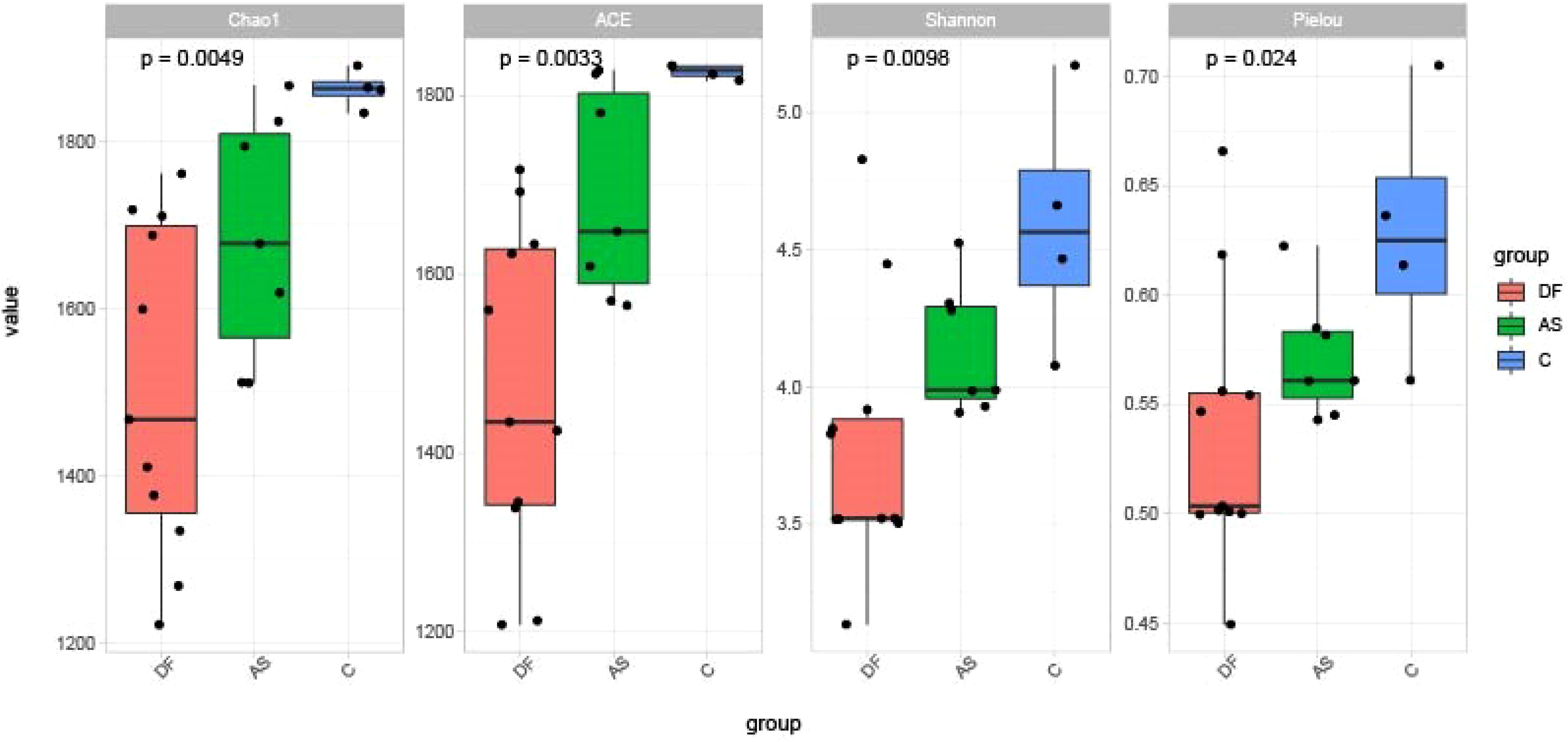 The alpha diversity among the three groups is shown in Figure 2. The diversity, richness, and evenness of species showed significant differences between the DF (P < 0.01), AS, and C groups, with the DF group having the lowest and the C group the highest.