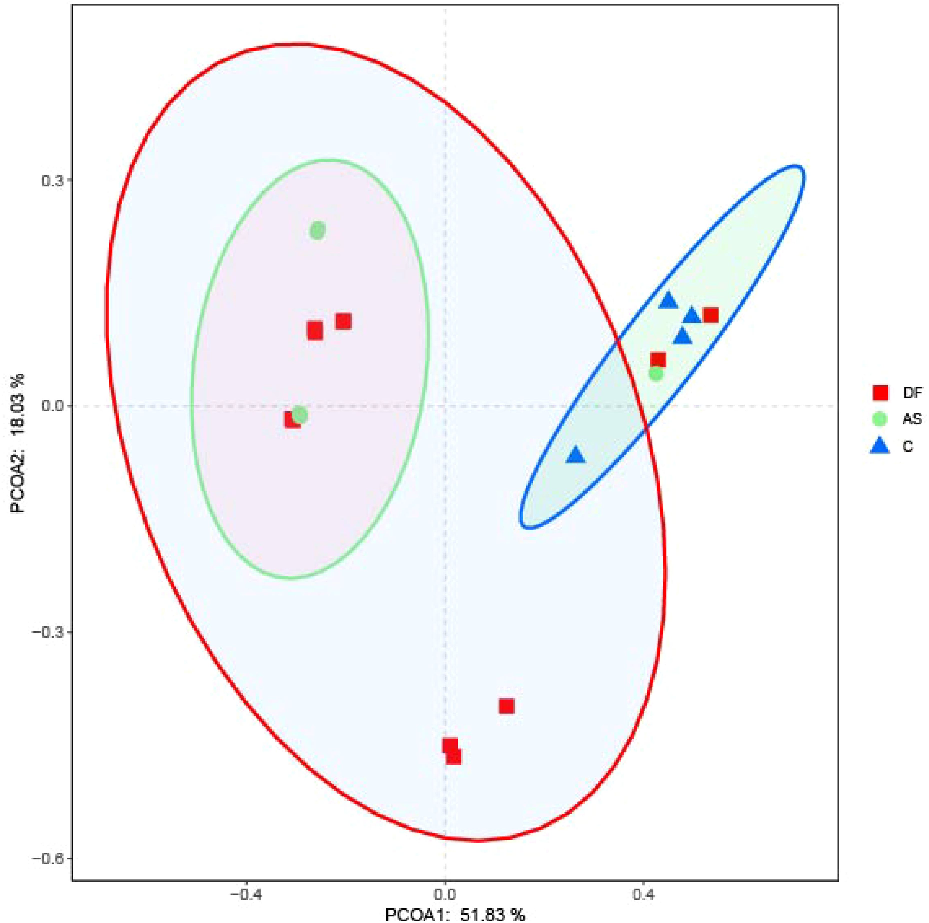 The beta diversity among the three groups is shown in Figure 3. Principal Coordinate Analysis (PCoA) based on the weighted UniFrac distance demonstrated that the samples in the DF and AS groups clustered more closely, suggesting that the bacterial evolutionary divergence between these two groups was similar, and their microbial community structures were also alike. In contrast, the C group was more distantly positioned from both the DF and AS groups, indicating a significant difference in bacterial community composition between the disease groups (DF and AS) and the healthy controls (C).