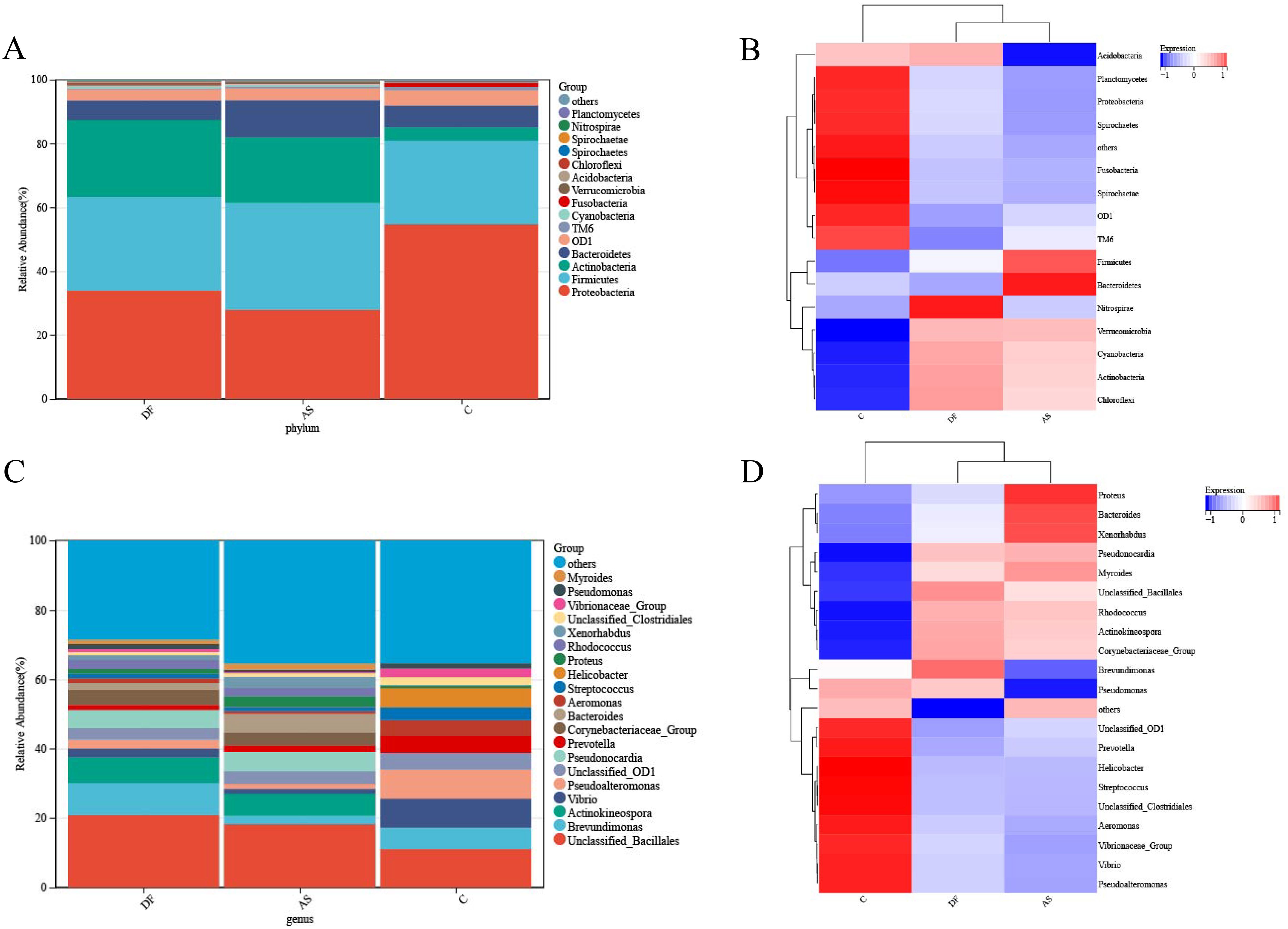 The DF group was primarily dominated by Unclassified_Bacillales, Brevundimonas, Actinokineospora, Pseudonocardia, Corynebacteriaceae_Group, and Unclassified_OD1. The AS group was mainly dominated by Unclassified_Bacillales, Actinokineospora, Pseudonocardia, Bacteroides, Corynebacteriaceae_Group, and Unclassified_OD1. The C group was dominated by Unclassified_Bacillales, Vibrio, Pseudoalteromonas, Brevundimonas, Helicobacter, Prevotella, Unclassified_OD1, Aeromonas, and Streptococcus.