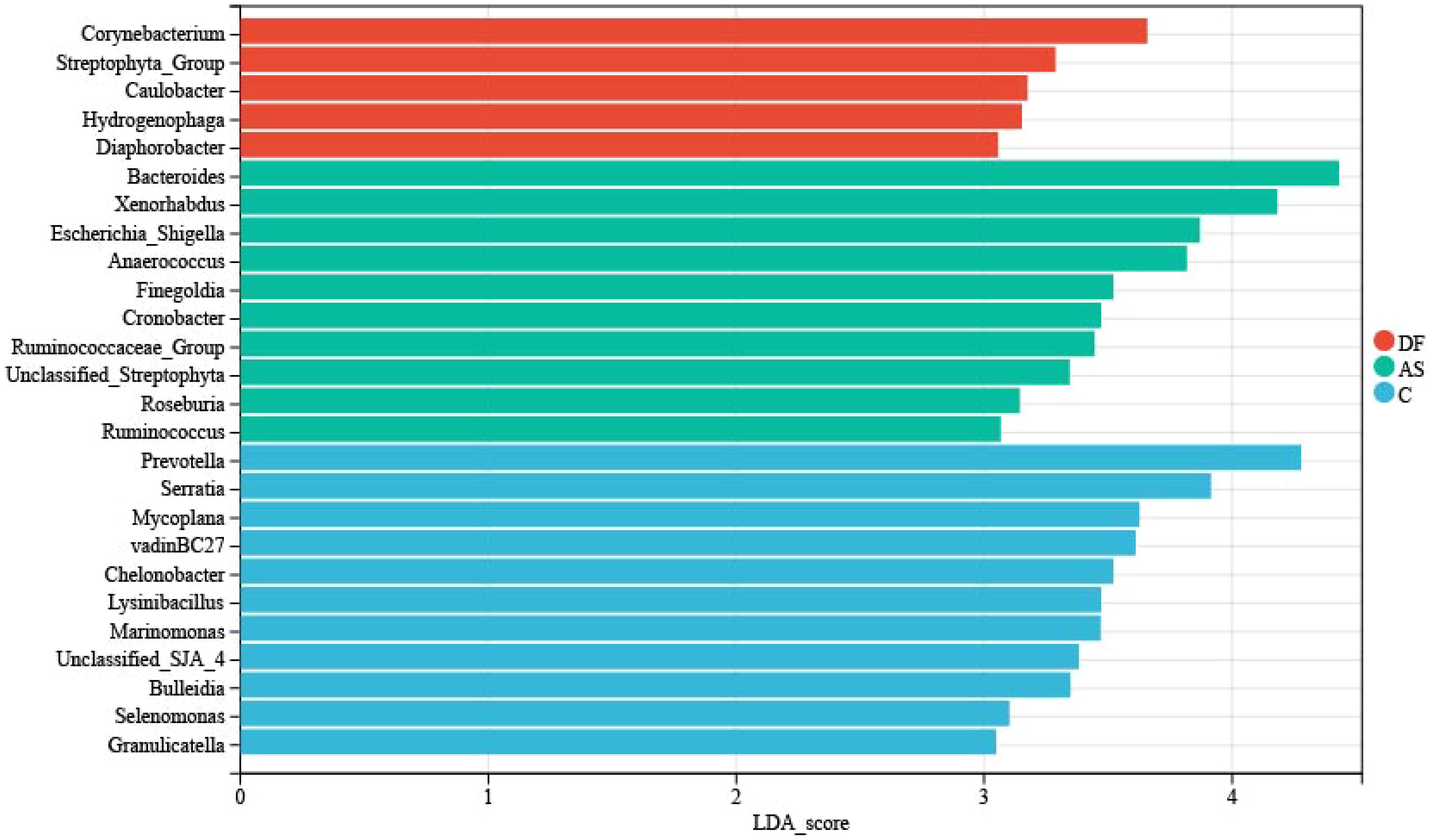 To further explore meaningful biomarkers, we conducted LEfSe analysis (Figure 5). The primary representative bacteria of the DF group were identified as Corynebacterium, Streptophyta_Group, Caulobacter, Hydrogenophaga, and Diaphorobacter. The main representative bacteria of the AS group were Bacteroides, Xenorhabdus, Escherichia_Shigella, Anaerococcus, Finegoldia, Cronobacter, Ruminococcaceae_Group, Unclassified_Streptophyta, Roseburia, and Ruminococcus. The primary representative bacteria of the C group were Prevotella, Serratia, Lysinibacillus, vadinBC27, Mycoplana, Chelonobacter, Marinomonas, Unclassified_SJA_4, Bulleidia, and Selenomonas.