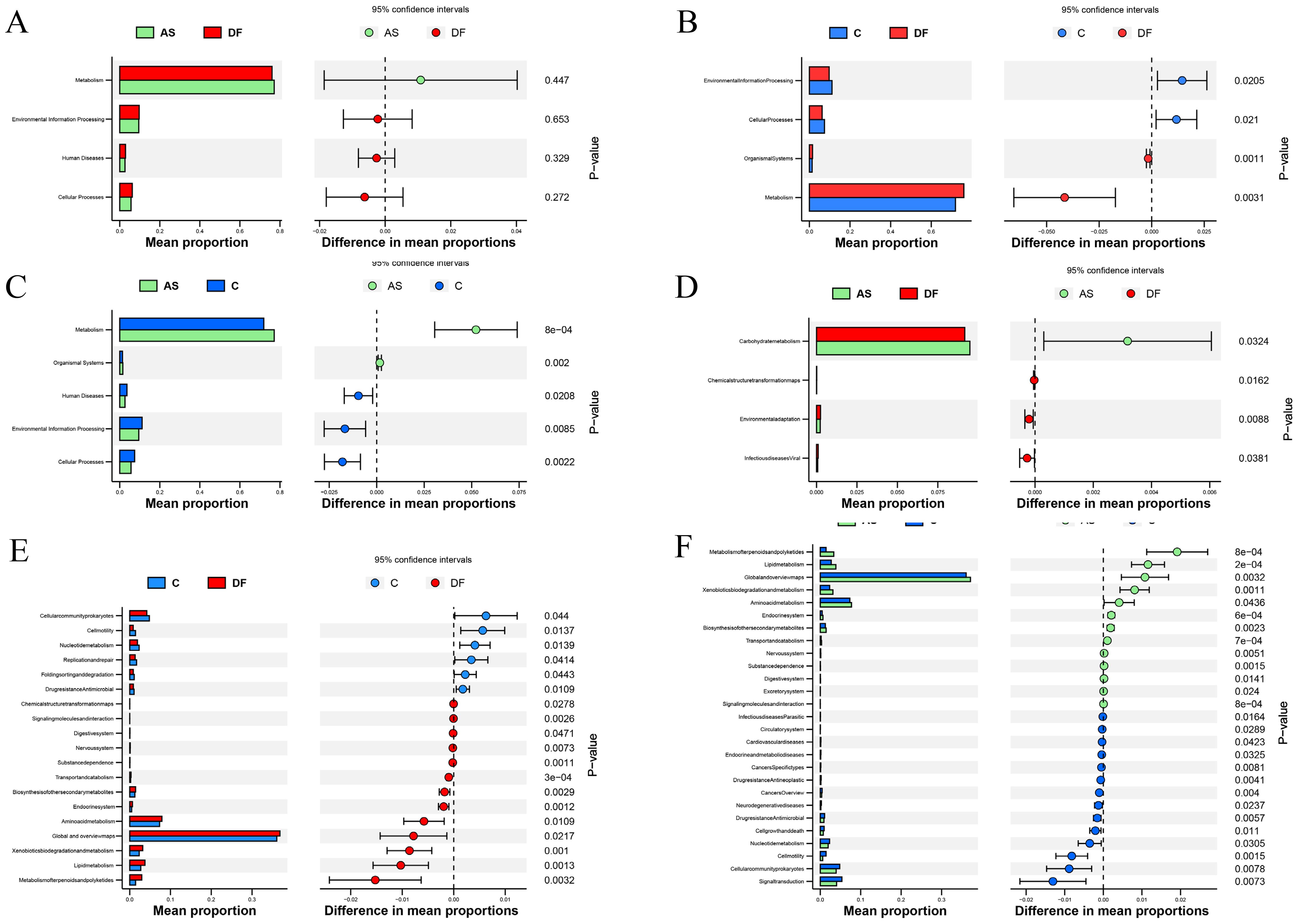 Figure 6. KEGG functional annotation analysis. KEGG functional annotation analysis identified metabolic pathways with significant intergroup differences. The left horizontal bar plot represents the relative abundance of enriched metabolic pathways as a percentage of total metabolic pathways in each group, while the right panel displays the corrected P-values. (A) No significant differences between DF and AS at level 1. (B) Significant functional differences between DF and C at level 1. (C) Significant functional differences between AS and C at level 1. (D) Significant functional differences between DF and AS at level 2. (E) Significant functional differences between DF and C at level 2. (F) Significant functional differences between AS and C at level 2.