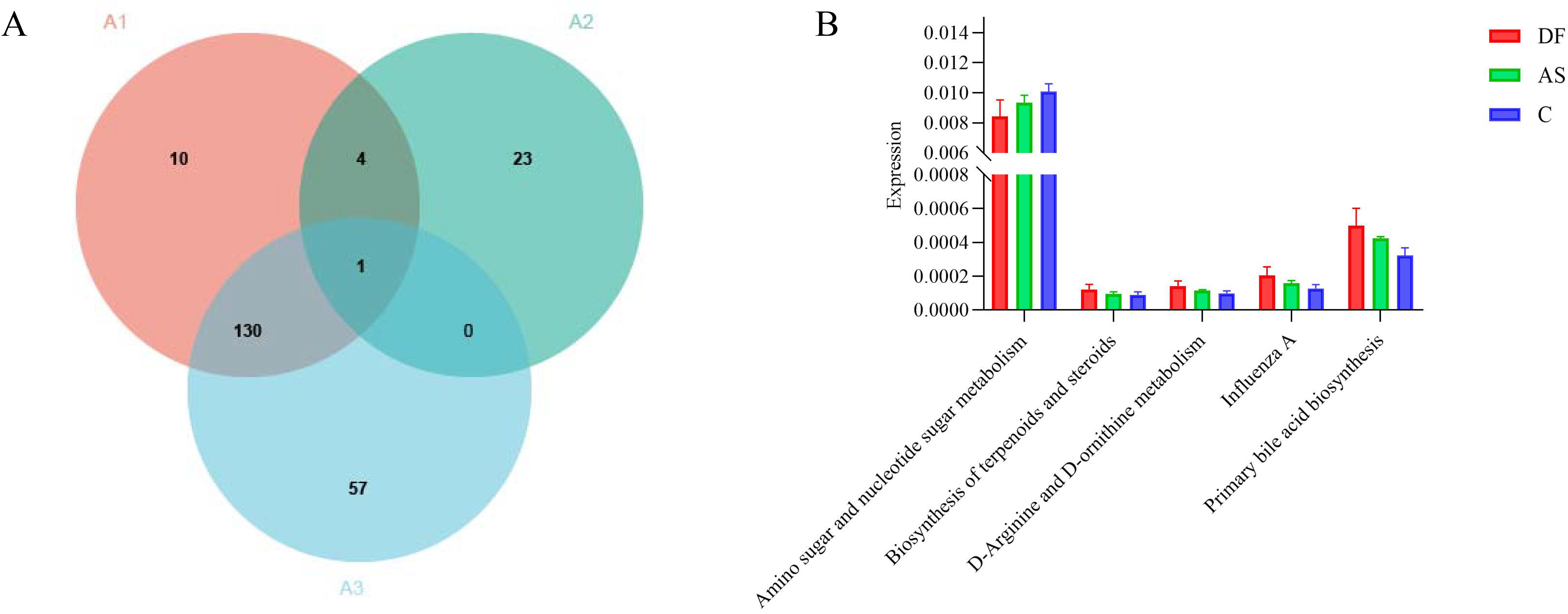 Figure 7. KEGG functional annotation analysis. (A) Number of significantly different functions at level 3: (A1) DF vs. C group. (A2) DF vs. AS group. (A3) AS vs. C group. (B) Intersection of differentially expressed genes between DF vs. C group and DF vs. AS group.