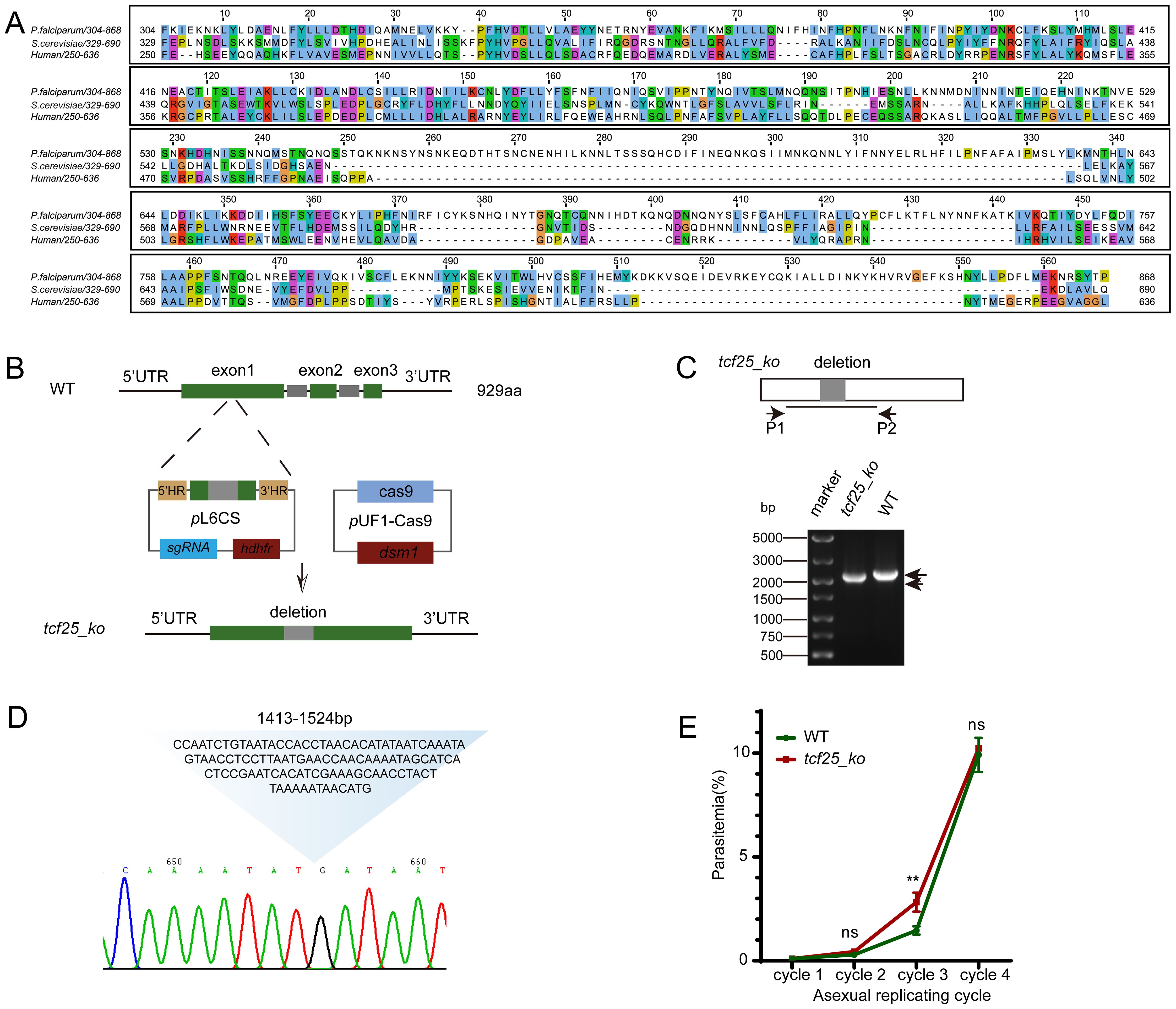 Figure 1. TCF25 deletion does not impair parasite replication during the asexual blood stage. (A) Alignment of PfTCF25 amino acid sequences from different species. The tcf25 homologous genes were retrieved from Saccharomyces cerevisiae (QHB07799.1) and Homo sapiens (NP_055787.1). (B) Schematic diagram of CRISPR-mediated tcf25 knockout in the WT strain. (C) DNA gel showing PCR validation of the tcf25_ko strain with the indicated primers. (D) Sanger sequencing results of the tcf25_ko strain, confirming the precise deletion of the 112bp target sequence. The chromatogram displays the edited genomic locus with the expected knockout junction. (E) Parasitemia dynamics during three consecutive culture cycles comparing WT and tcf25_ko strains. Data represent mean ± SEM (n=3 biological replicates). **p < 0.01; ns, not significant (two-tailed Student’s t-test).