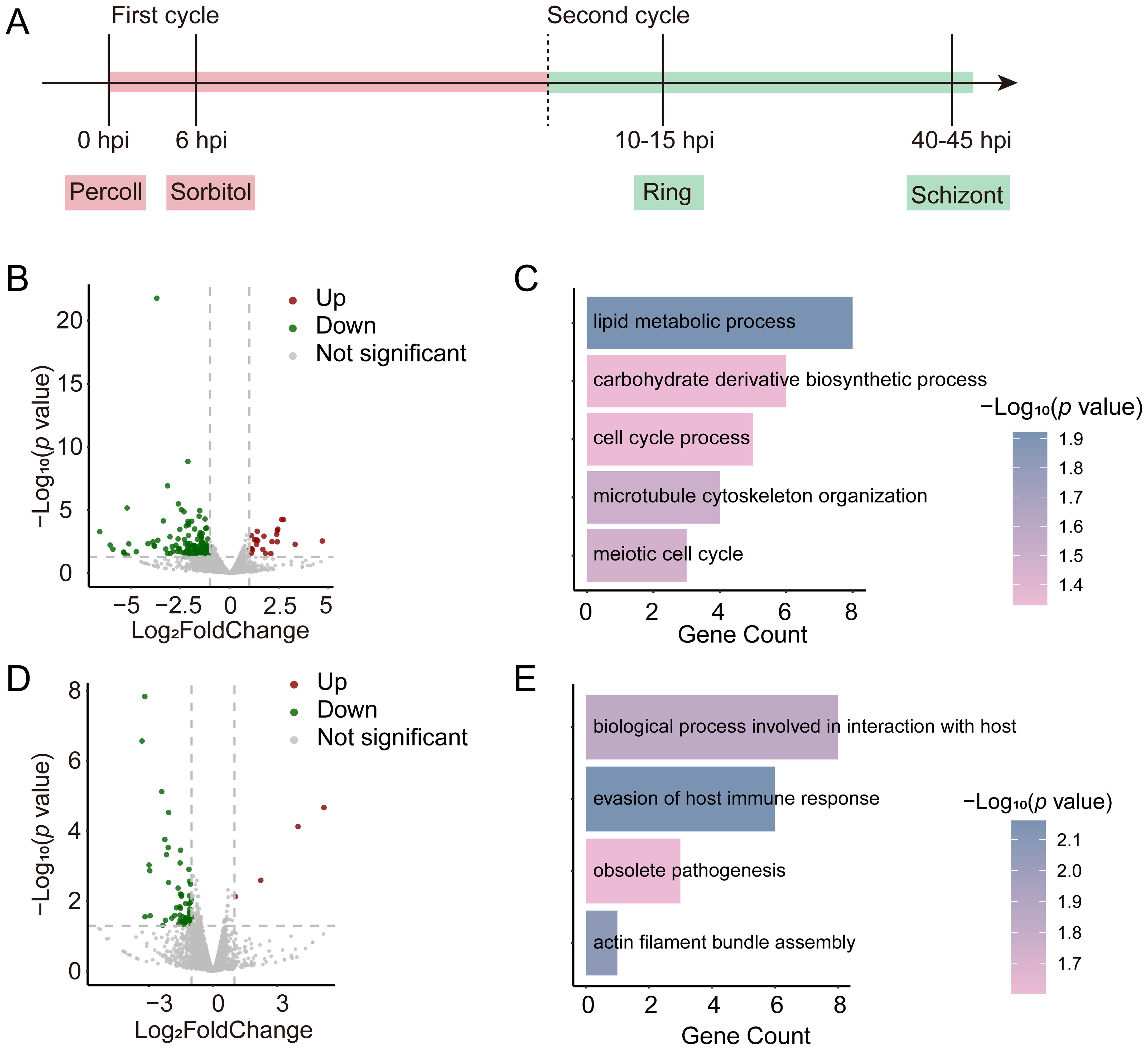 Significantly differentially expressed genes were functionally annotated, and Gene Ontology (GO) enrichment analysis was performed in the PlasmoDB website (https://plasmodb.org/plasmo/app), with significance determined by the hypergeometric test (p < 0.05). All statistical analyses and visualizations were generated using ggplot2 (v3.5.2) in RStudio.