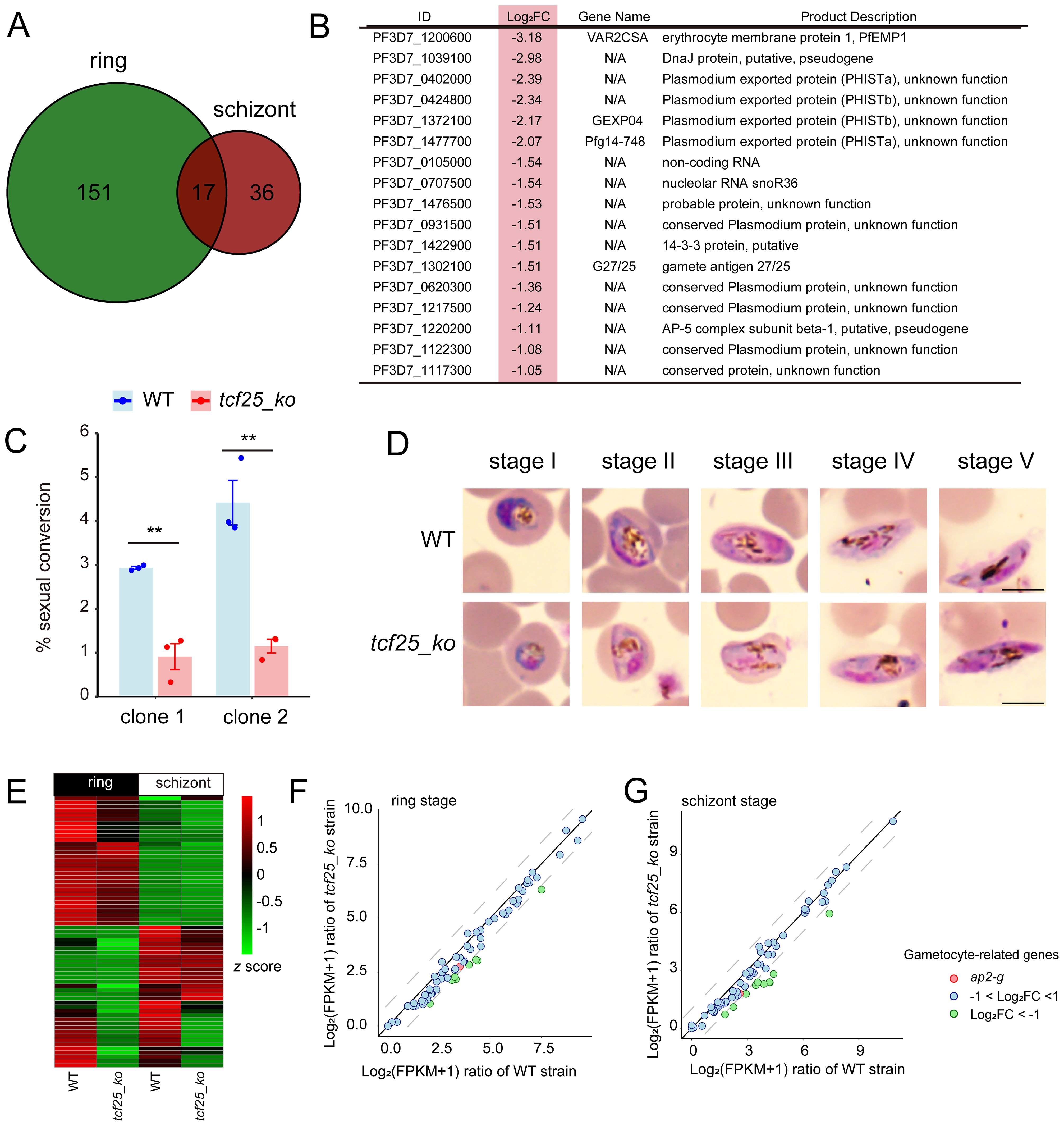 Figure 3. TCF25 deletion significantly affects gametocyte formation. (A) Venn diagram of downregulated transcripts at ring and schizont stages. (B) Commonly downregulated genes in both ring and schizont stages, with light red highlighting indicating their log2 fold changes at the schizont stage. (C) Sexual conversion rates of WT and two independently generated tcf25_ko clone strains following gametocyte induction (n=3 biological replicates). (D) Gametocyte development progression in WT and tcf25_ko strains. While tcf25 deletion exhibited reduced gametocyte numbers, mature forms were still detectable. Scale bars: 5 μm. (E) Heatmap of expression changes for gametocyte-related genes in WT and tcf25_ko strains at the ring and schizont stage. (F, G) Scatter plot of expression changes for gametocyte-related genes in WT and tcf25_ko strains at the ring (F) or schizont (G) stage. **p < 0.01 (two-tailed Student’s t-test).