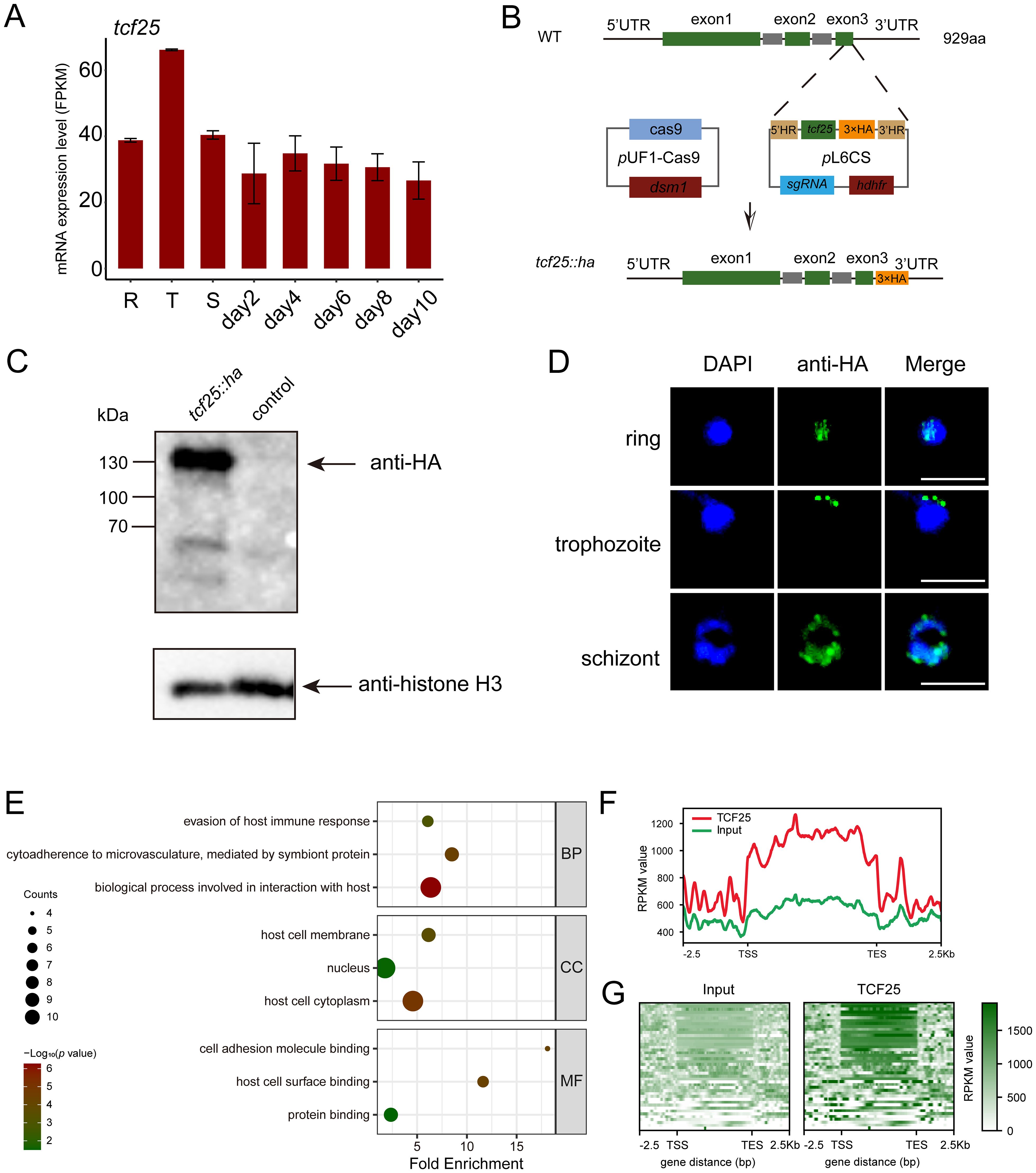 Figure 4. Identification of TCF25 protein-binding target genes. (A) Expression profile of tcf25 during the IDC and gametocyte development (published dataset reanalysis). (B) Schematic of tcf25 C-terminal HA-tagging strategy. (C) Western blot validation of TCF25-HA (expected molecular weight) with histone H3 loading control. (D) Localizations of TCF25 during asexual development stages. Representative IFA images showing HA signal (green), DNA (DAPI, blue), and merged channels at ring, trophozoite, and schizont stages. Scale bars: 5 μm. (E) GO enrichment analysis of TCF25 ChIP-seq targets (BP: biological processes, CC: cellular components, MF: molecular functions). (F) Line plot of TCF25 chromatin occupancy, showing average enrichment across all target genes. Profiles are aligned from 2.5 kb upstream of the transcription start site (TSS) to 2.5 kb downstream of the transcription end site (TES). (G) Heatmap of TCF25 chromatin occupancy, displaying enrichment across all target genes. Profiles are aligned from 2.5 kb upstream of the TSS to 2.5 kb downstream of the TES.