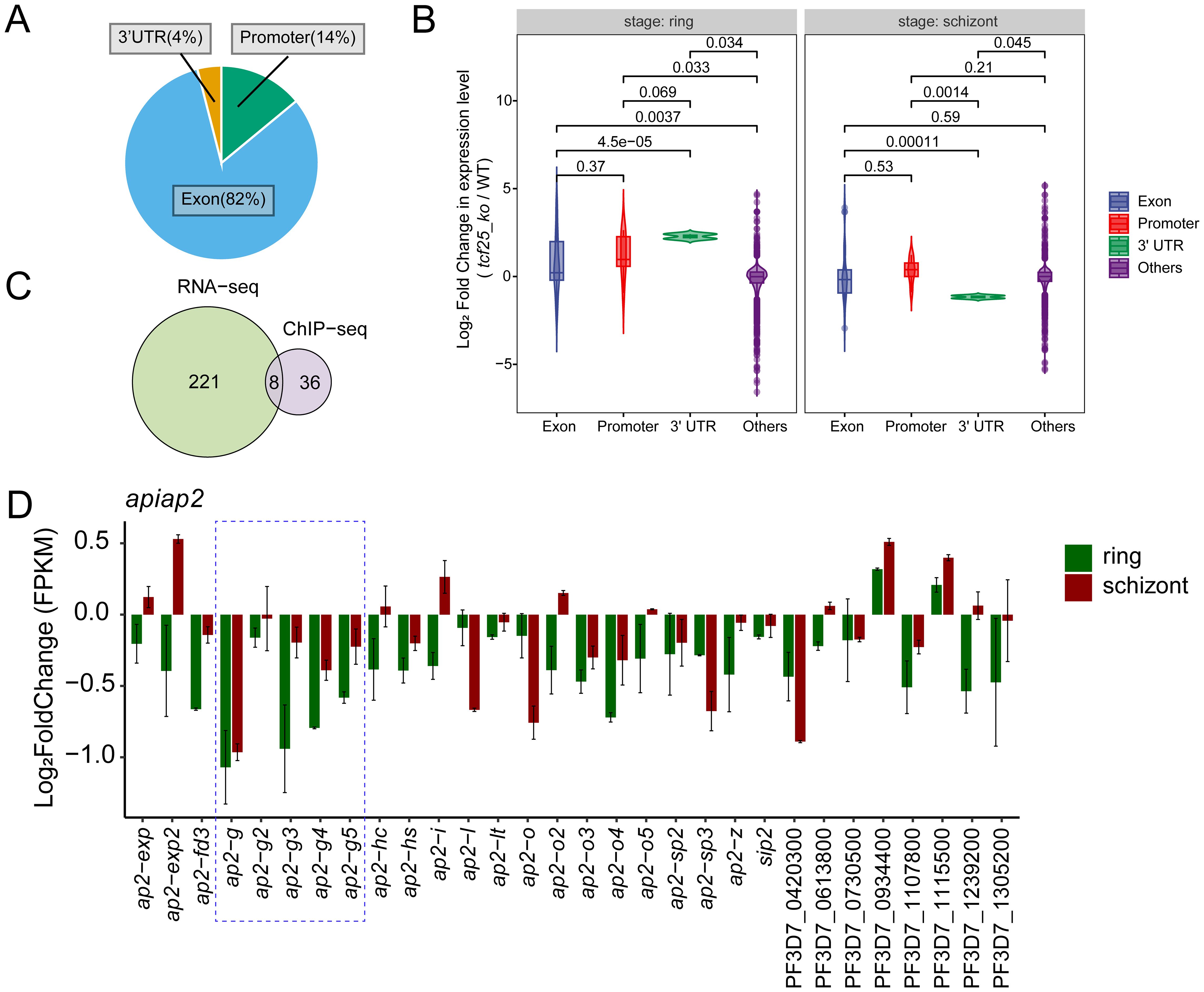 Figure 5. TCF25 influences gametocytogenesis via ap2-g pathway. (A) Pie chart showing the percentage of TCF25 peaks located in different genomic regions. (B) Violin plots display the distribution of gene expression changes (log2 fold change) for genes with TCF25 binding in different genomic regions. P-values indicating statistical significance of differences between groups are shown above each comparison. (C) Venn diagram comparing TCF25 binding genes and DEGs from transcriptomic analysis. (D) Expression changes (log2 fold change) of 30 ApiAP2 transcription factors in tcf25_ko versus WT.