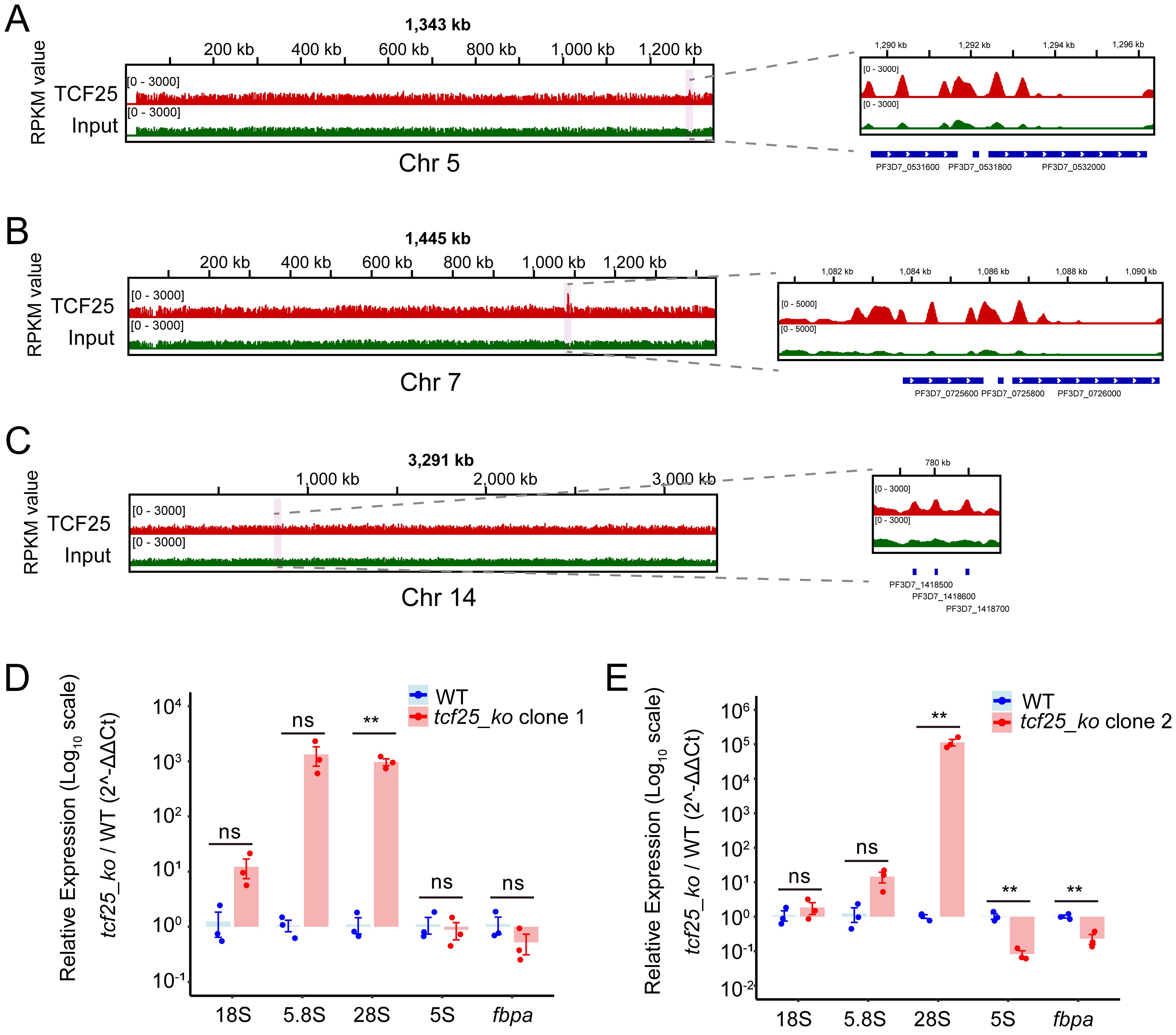 Figure 6. TCF25 significantly binds and regulates rDNA. (A–C) IGV visualization of TCF25 protein distribution on chromosome 5 (A), chromosome 7 (B), and chromosome 14 (C). The left panel shows the distribution across the chromosome, while the right panel displays the distribution on the rDNA clusters. The light pink highlighted regions indicate the chromosomal locations of the zoomed-in areas. (D, E) Quantitative RT-qPCR analysis of rRNA expression in two independently generated tcf25_ko clone lines. Data represent mean ± SEM of three biological replicates, normalized to PF3D7_0717700 and expressed relative to WT expression levels. Relative expression levels of the fbpa gene were used as positive controls. **p < 0.01; ns, not significant (two-tailed Student’s t-test).