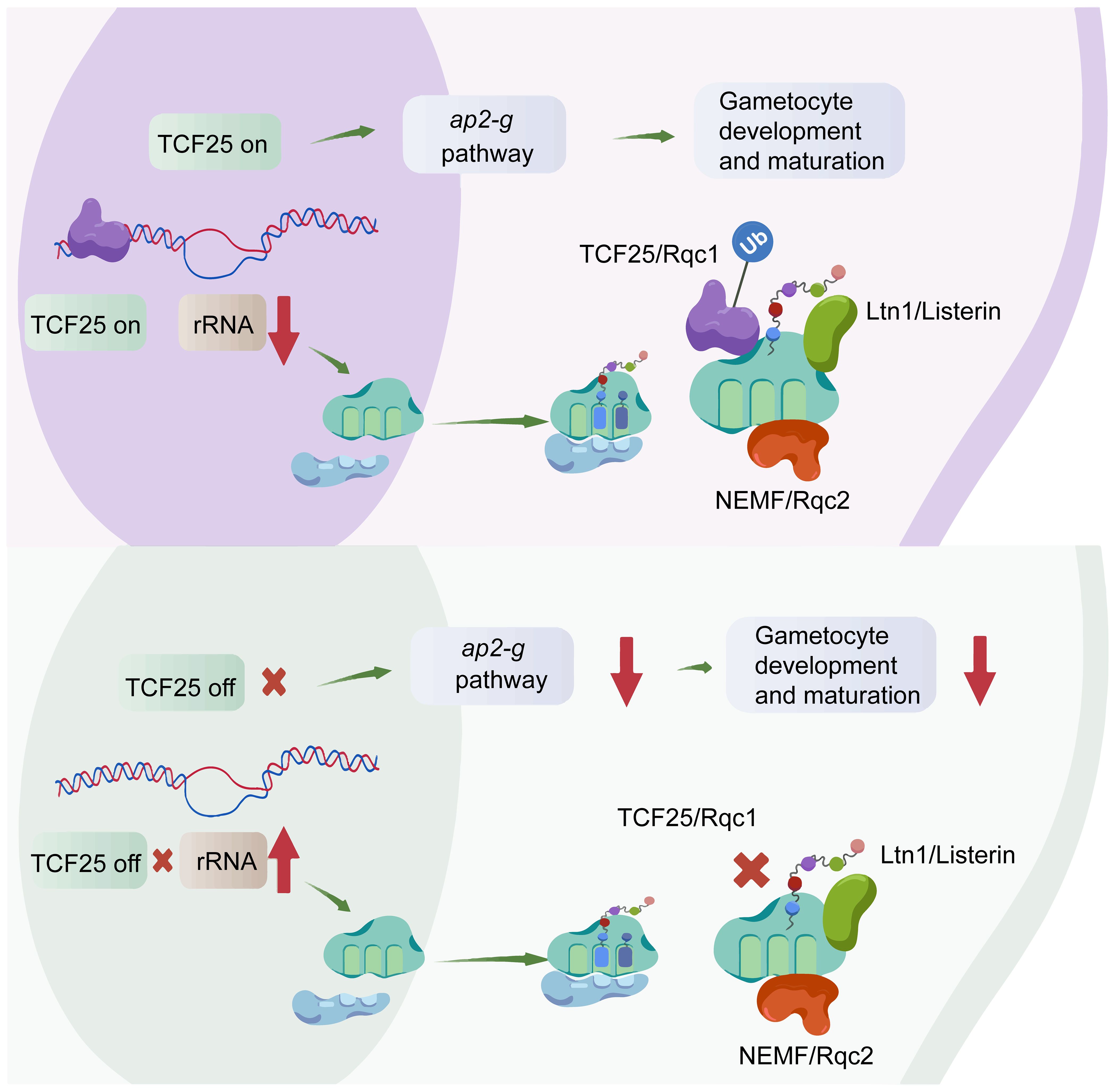 Figure 7. Model of TCF25’s dual regulation of gametocytogenesis and ribosome biogenesis. Created with BioGDP (https://biogdp.com/).