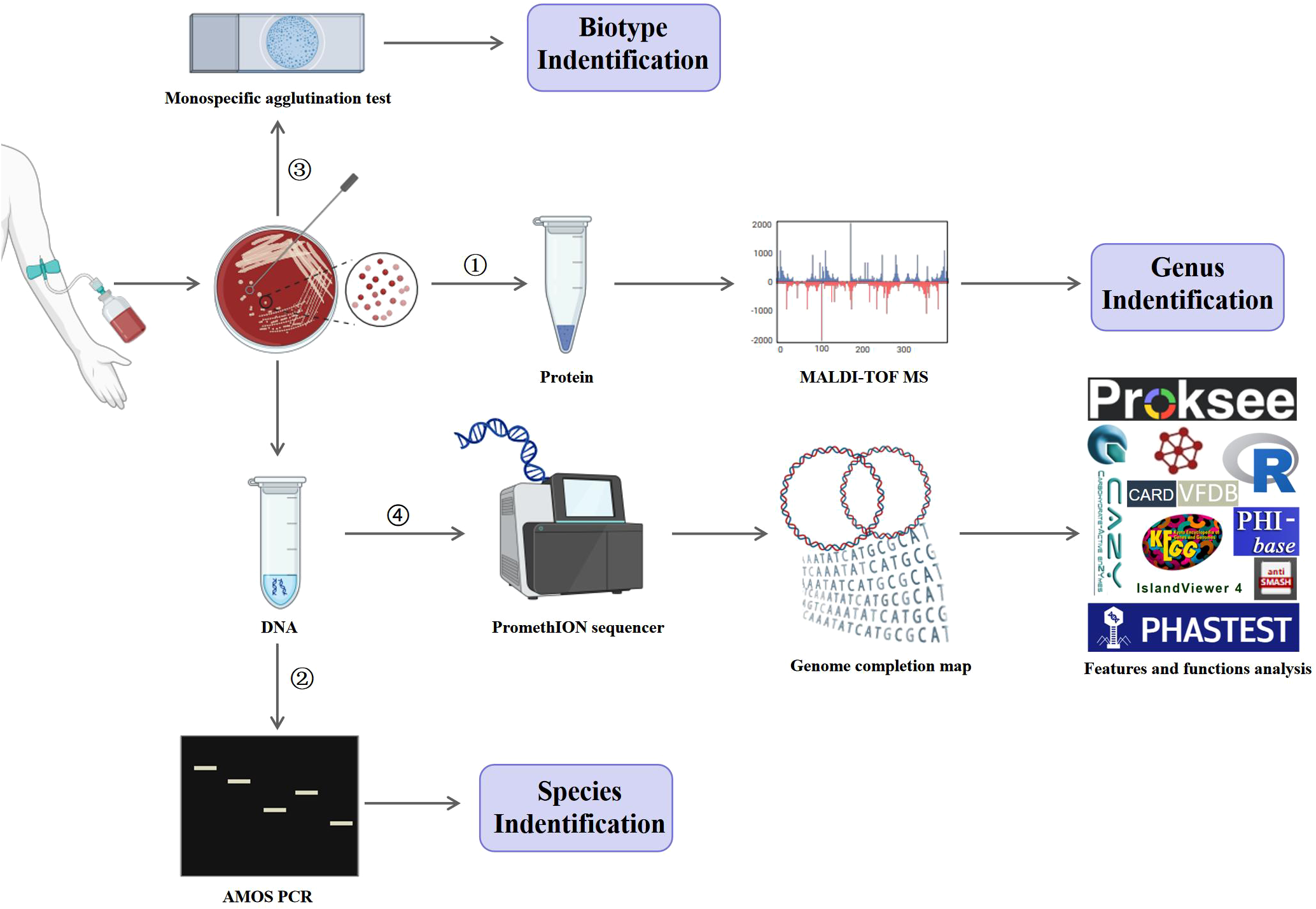 Strain IMHB1, isolated from the patient’s blood, was identified at the genus, species, and biotype levels by MALDI-TOF MS, AMOS PCR, and monospecific agglutination tests, respectively. As illustrated in Figure 1, the DNA of strain IMHB1 was sequenced on PromethION sequencer and Illumina NovaSeq platforms, and a complete genome map was constructed. Genome features and functions were analyzed using Proksee (Grant et al., 2023), R software (R Core Team, 2022), and specialized functional tools and databases, including public databases for molecular typing and microbial genome diversity (PubMLST) (Jolley et al., 2018), phage search tool with enhanced sequence translation (PHASTEST) (Wishart et al., 2023), an integrated interface for computational identification and visualization of genomic islands (IslandViewer 4) (Bertelli et al., 2017), carbohydrate-active enzymes (CAZy) database (Lombard et al., 2024), CARD (Alcock et al., 2023), antibiotics and secondary metabolite analysis shell (antiSMASH) (Blin et al., 2023), evolutionary genealogy of genes: non-supervised orthologous groups (eggNOG) database (Huerta-Cepas et al., 2018), kyoto encyclopedia of genes and genomes (KEGG) database (Kanehisa and Goto, 2000), VFDB (Liu et al., 2022), and pathogen host interactions (PHI-base) database (Urban et al., 2022).