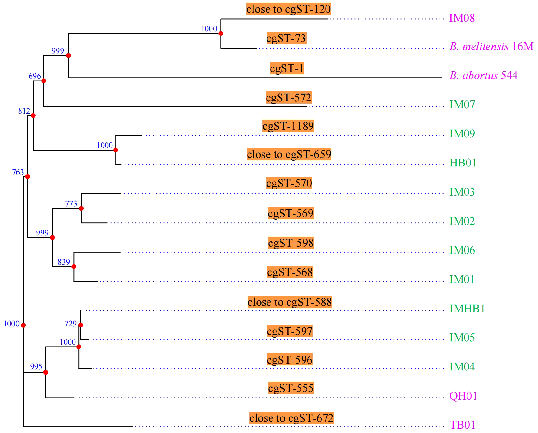 The comparative cgMLST analysis of 15 Brucella genomes from the PubMLST database, including strain IMHB1, revealed 15 distinct cgMLST sequence types (cgSTs), demonstrating substantial genetic diversity among the isolates. Strain IMHB1 showed no exact match in the database; its closest related profile was cgST-588, differing at five loci. The phylogenetic tree based on cgMLST allelic profiles grouped the 15 strains into nine primary clusters (Figure 3). Within this phylogeny, IMHB1 exhibited a close evolutionary relationship with two other human-derived B. melitensis strains from Inner Mongolia, whereas a sheep-derived strain from the same region was most closely related to the reference strain B. melitensis 16M.