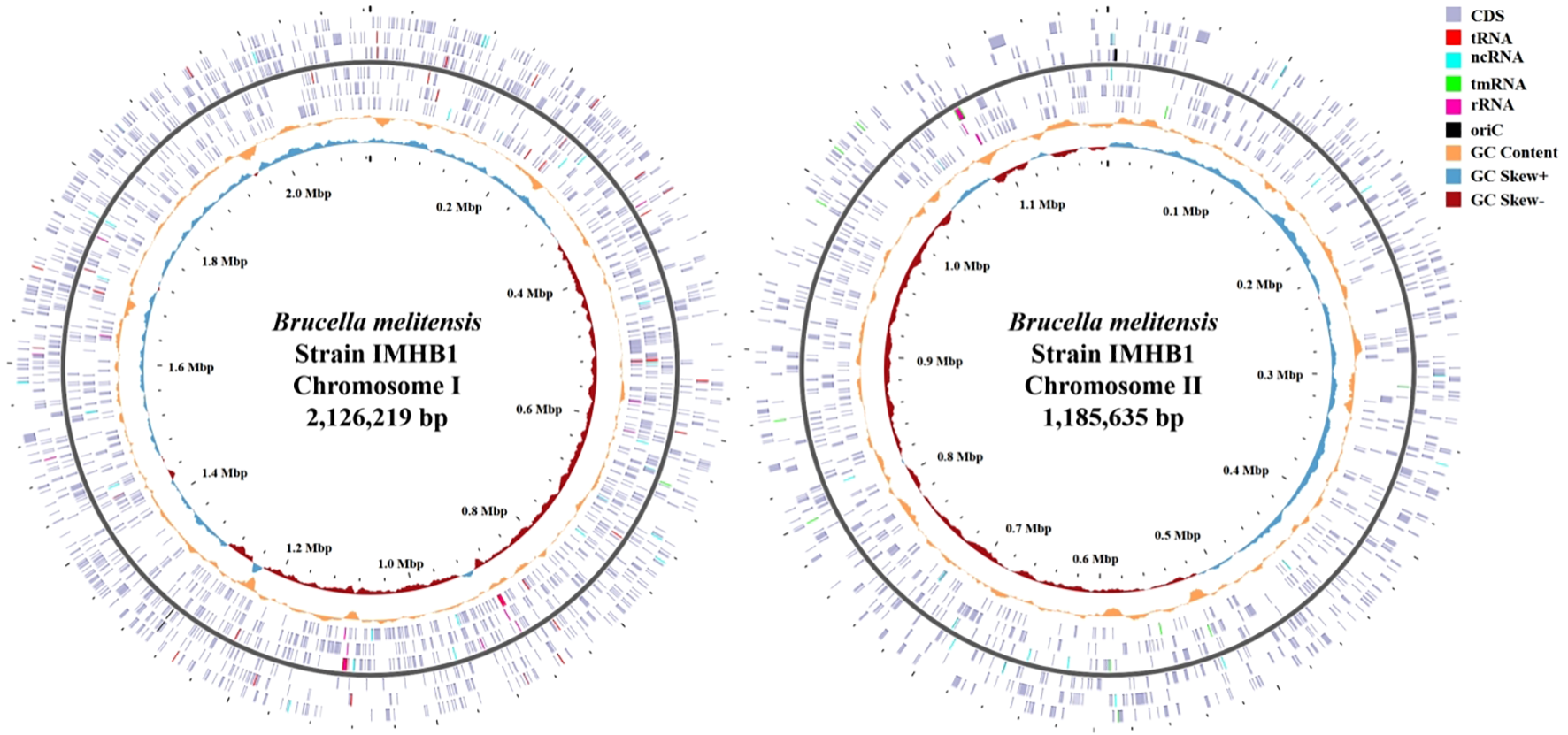 Completed genomic circle map of Brucella melitensis strain IMHB1. Left: Complete genomic circle map of chromosome I, comprising 2,038 CDSs, 41 tRNAs, one tmRNA, six rRNAs, 27 ncRNAs, and two oriCs. Right: Complete genomic circle map of chromosome II, comprising 1114 CDSs, 14 tRNAs, three rRNAs, 12 ncRNAs, and one oriC. The light purple block represents CDS; red, tRNA; bright blue, ncRNA; green, tmRNA; rose pink, rRNA; black, oriC; the orange-yellow curve, GC content; the light blue curve, GC skew (+); and dark red curve, GC skew (-).