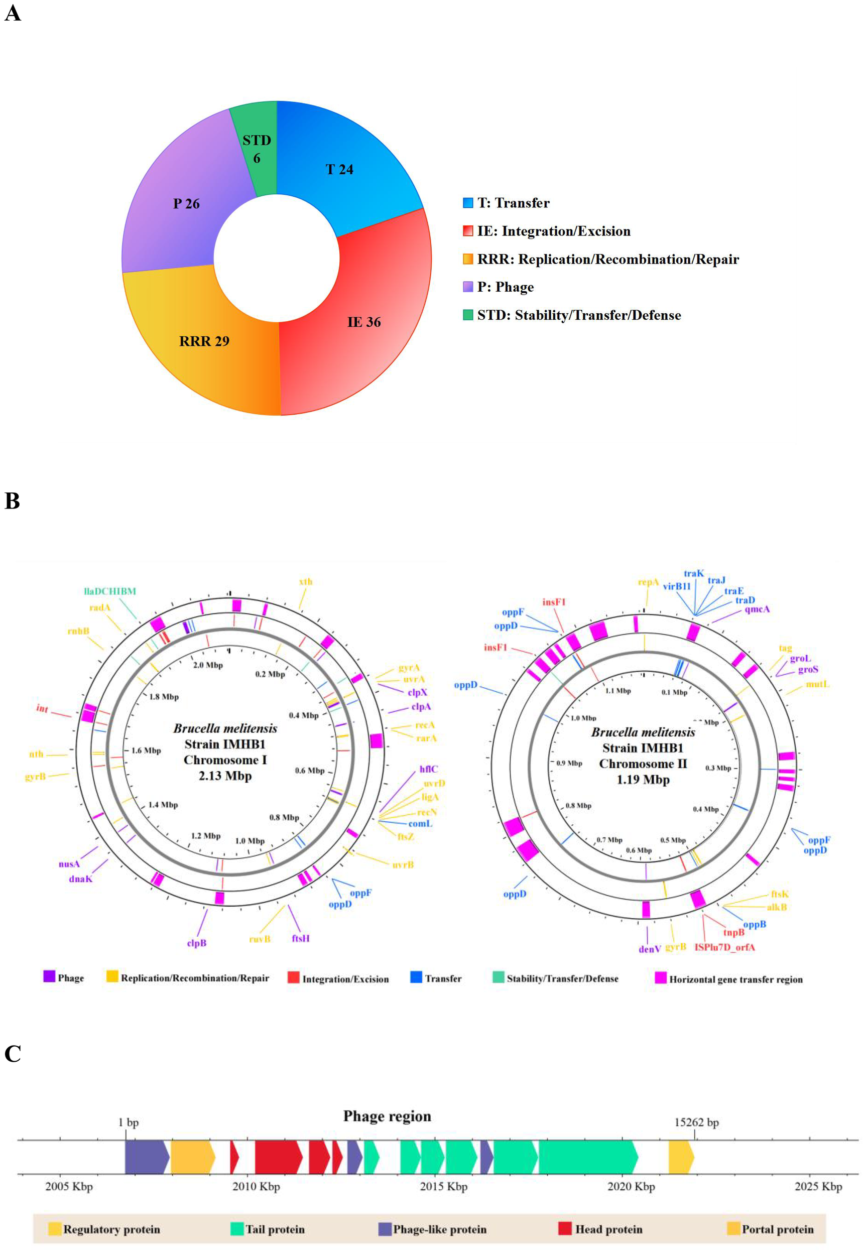 Genomic functional features of Brucella melitensis strain IMHB1. (A) Composition of 121 mobile genetic elements (MGEs). (B) Distribution of 121 MGEs and 36 putative horizontal gene transfer (HGT) regions across the two chromosomes of strain IMHB1. (C) Location and composition of the integrated phage genome on chromosome I of strain IMHB1.