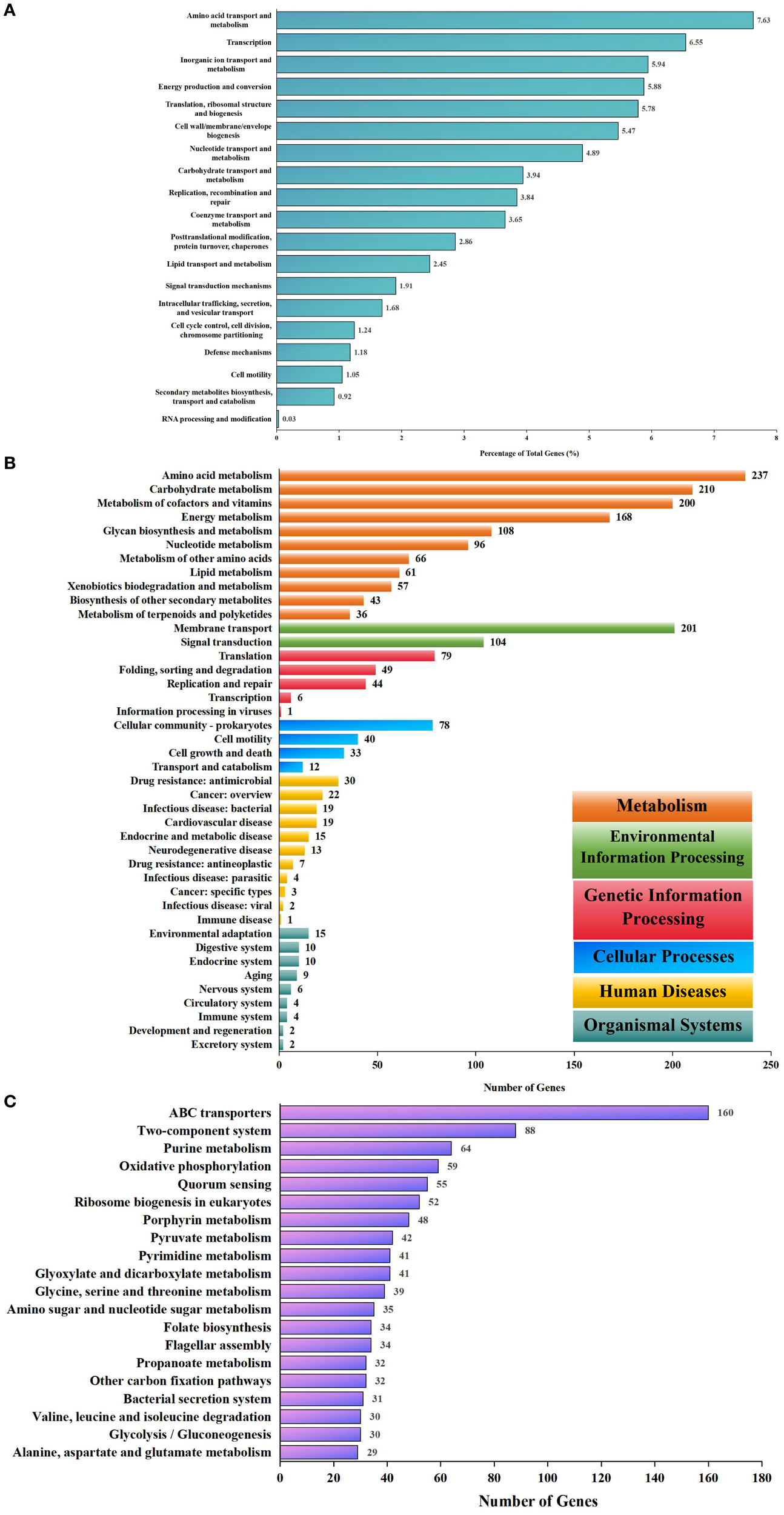 Functional annotation of strain IMHB1 identified features related to gene islands, carbohydrate-active enzymes, biosynthetic gene clusters, and antibiotic resistance genes. Seven GIs were predicted to be located on chromosome I (comprising 113 genes) and three on chromosome II (containing 63 genes) by the IslandPath-DAMOB method (Figure 6A). To identify potential virulence islands, genes inside and outside the predicted GIs were annotated against the VFDB database, indicating that no significant enrichment of virulence determinants was observed outside the predicted GIs (P > 0.05).