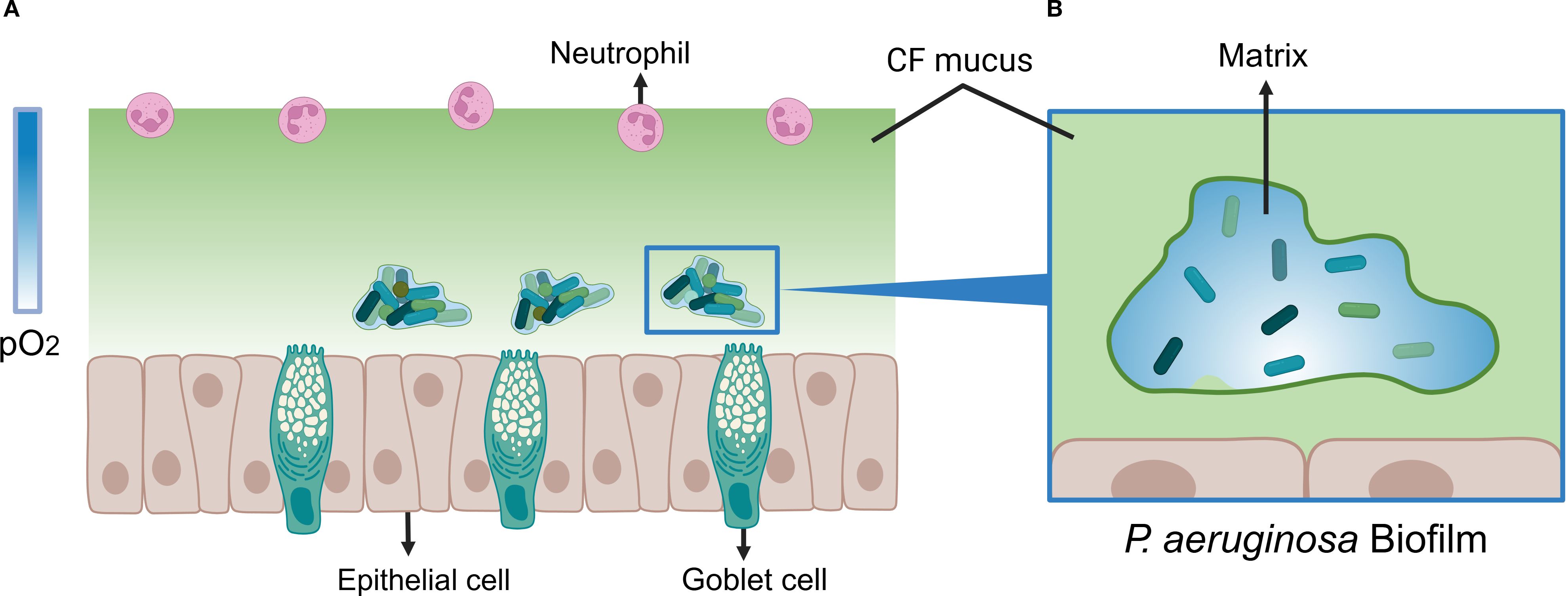 Figure 1. Model of P. aeruginosa Biofilm Under Oxygen-Limited Conditions. (A) P. aeruginosa biofilm model in cystic fibrosis (CF) mucus under oxygen-limited conditions. The color bar on the left side of the figure represents the partial pressure of oxygen (pO2). The gradient from deep to light blue indicates an increasing anaerobic state within the mucus. Goblet cells continuously secrete mucus, and combined with elevated oxygen consumption by host cells, a steep oxygen gradient forms within the thickened CF mucus (depicted in light green). P. aeruginosa forms biofilms within the hypoxic regions of the mucus, provoking a chronic inflammatory response in the host. This response leads to neutrophil infiltration and a respiratory burst, which further depletes oxygen levels within the mucus. (B) Oxygen-Limited Microenvironment within P. aeruginosa Biofilm. The transition from deep to light blue illustrates the gradual decrease in oxygen concentration observed inside the biofilm. Oxygen depletion occurs predominantly in the deep regions (white area). This gradient arises because oxygen is directly consumed by host cells and bacterial respiration at the biofilm surface, leading to a progressive oxygen decline with increasing distance from the surface. Created with BioRender.com.